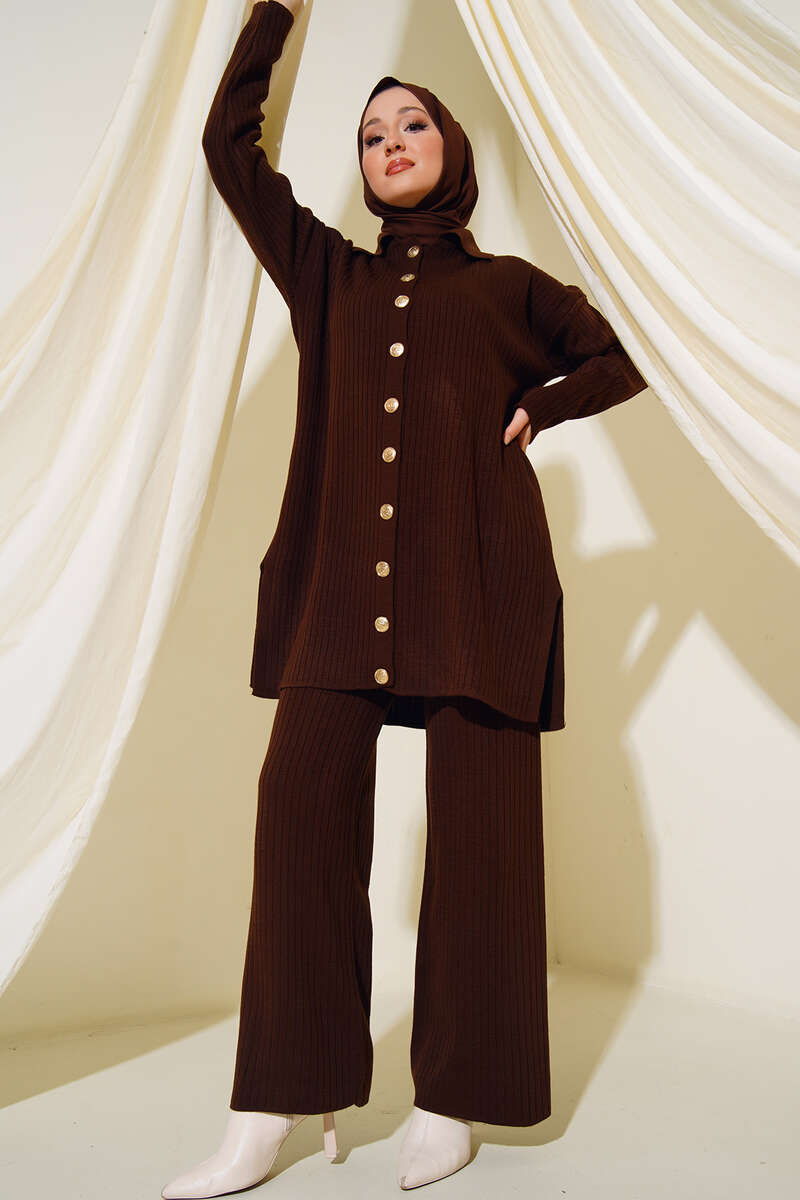 İkili takımımız pantolon ve tunik olarak iki parçadan oluşmaktadır. Tuniğimiz sarı arma düğmelere sahiptir ve düşük omuzludur. Etek kısımlarında yırtmaç detayları bulunmaktadır. Pantolon bol paçalıdır ve cepsiz modeldir.