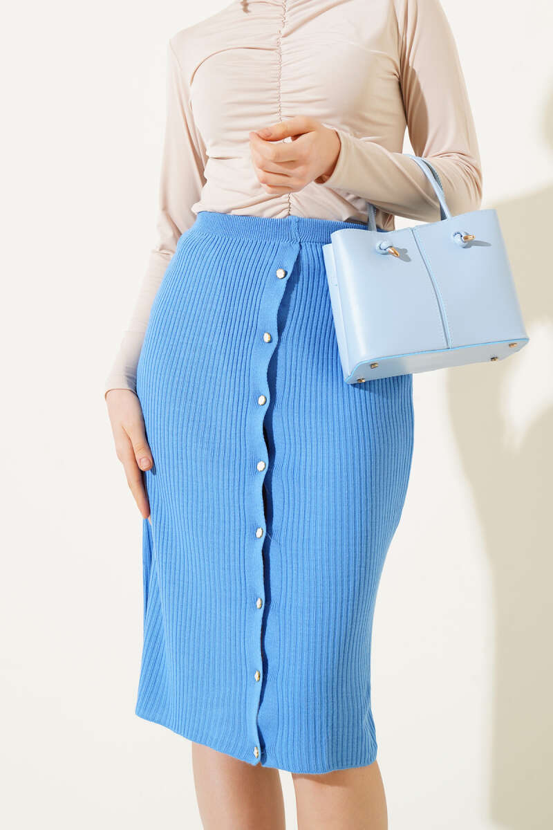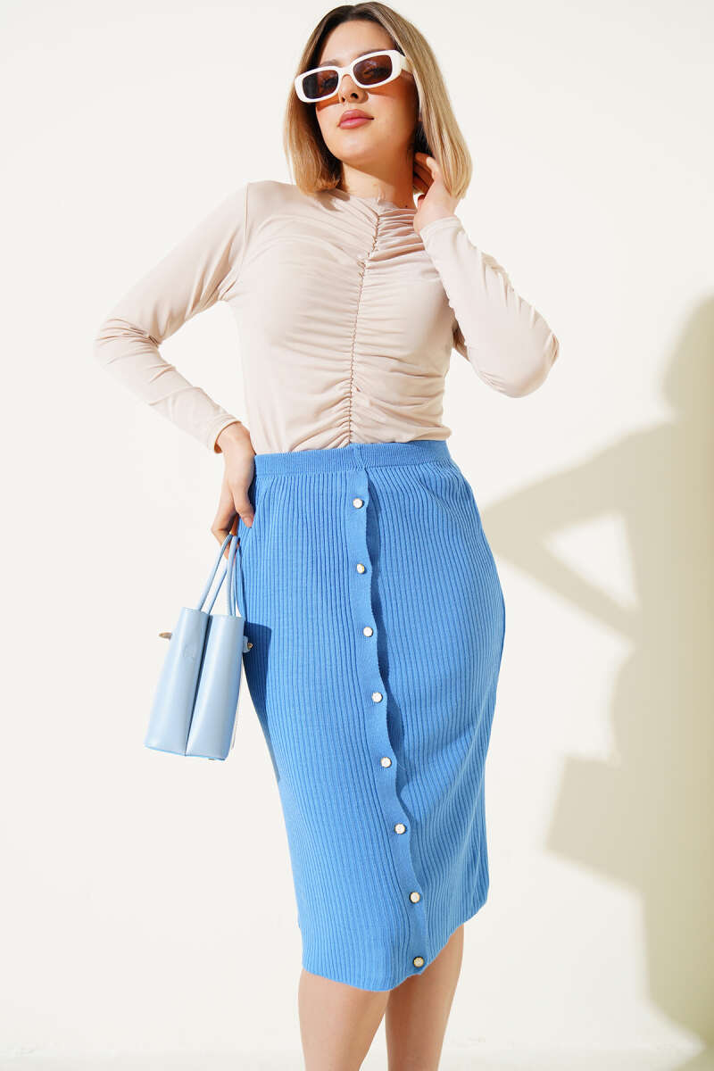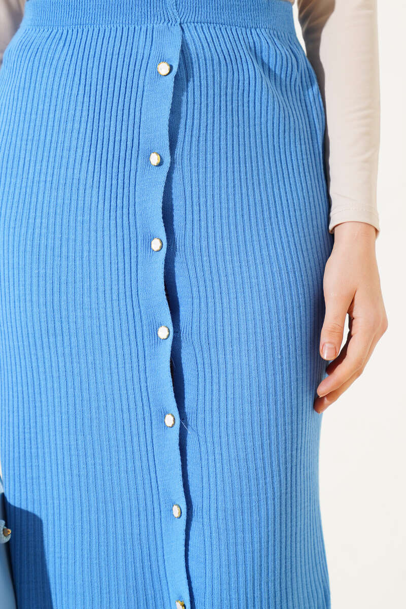 Boydan Düğmeli Fitilli Triko Midi Etek İndigo