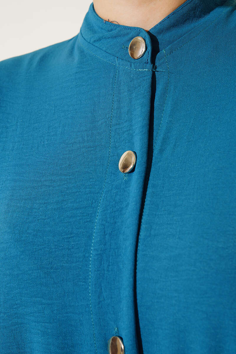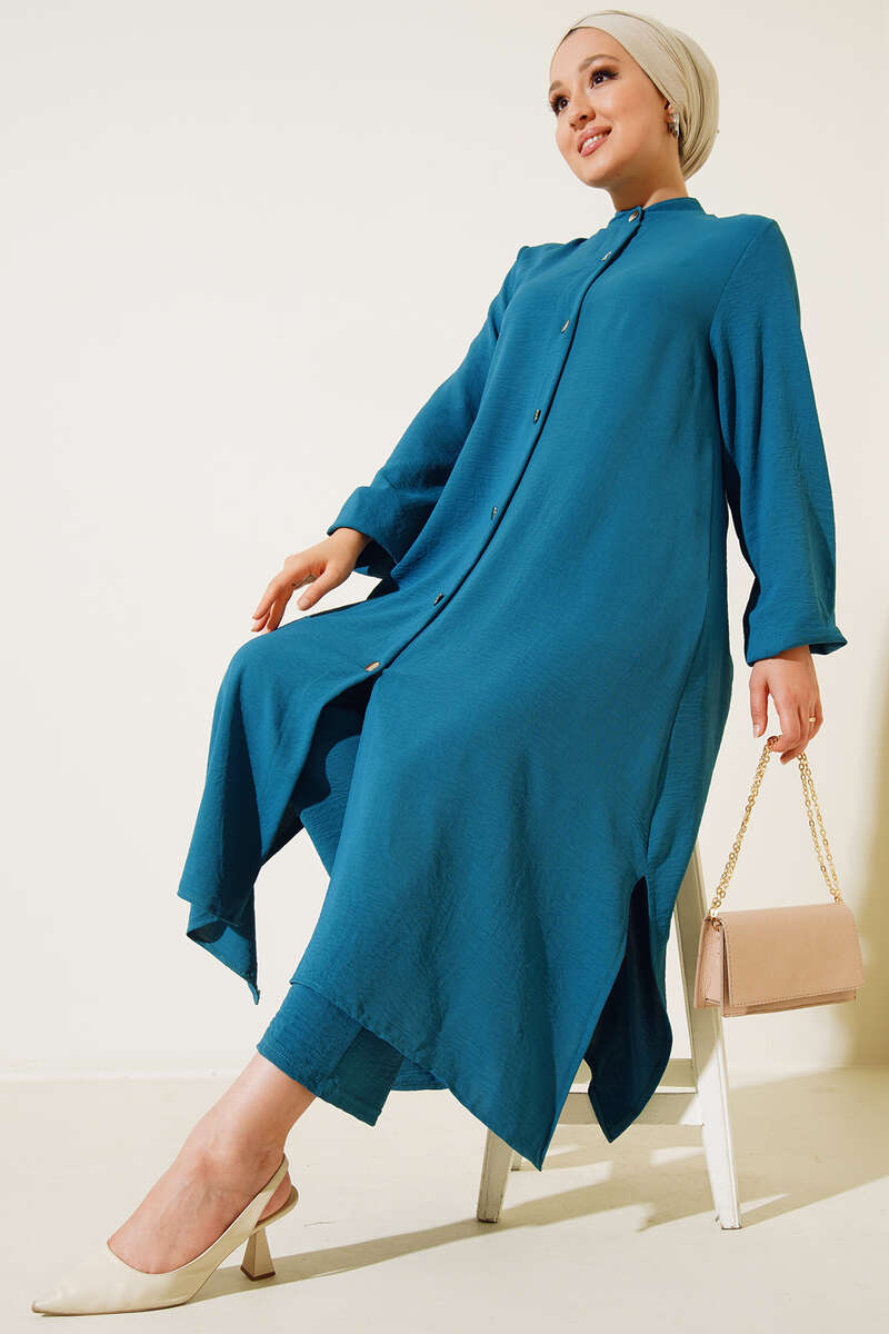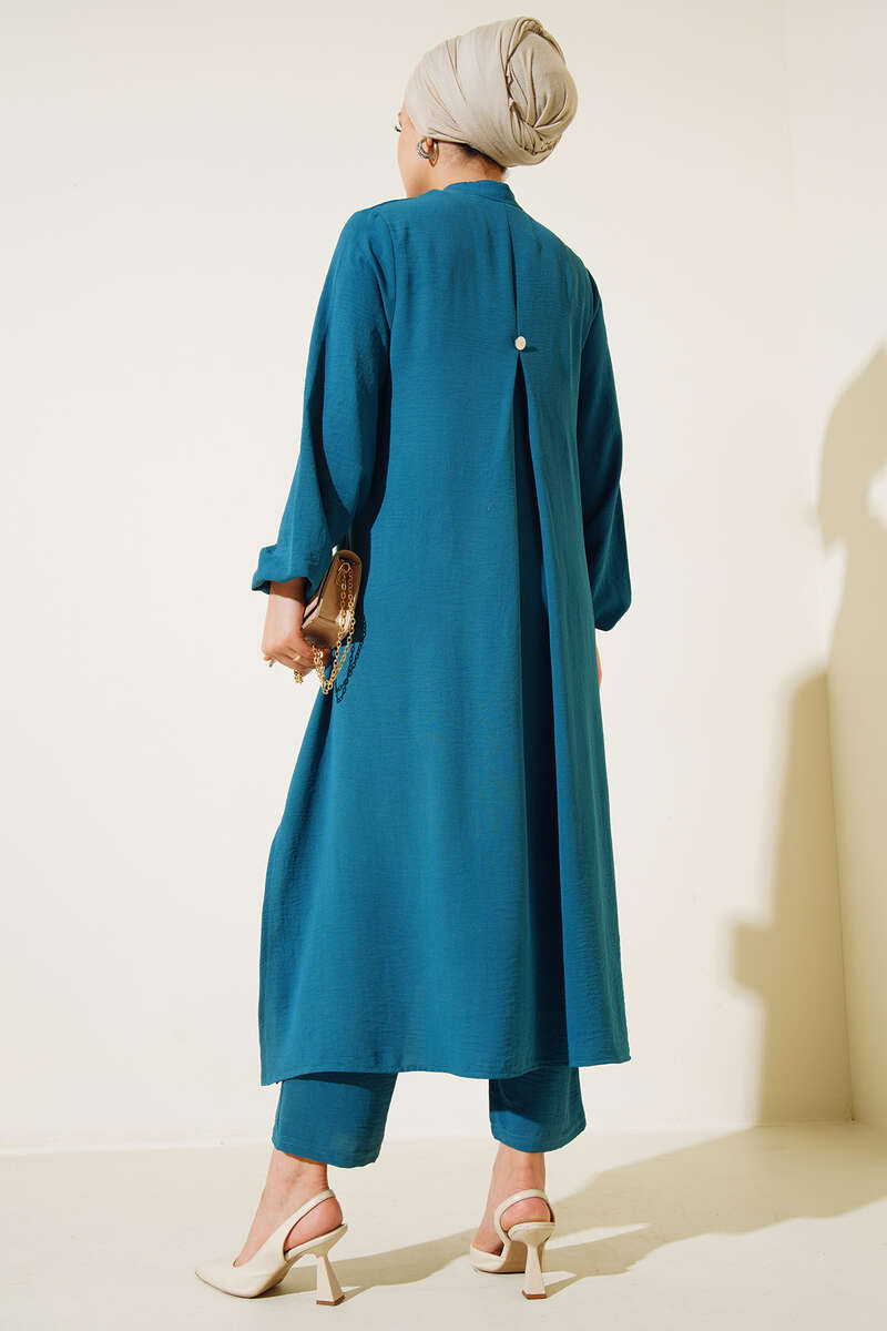 Yeni sezon ikili takımımız oldukça şık bir tasarıma sahiptir. İkili takımımızın tuniği boydan düğmelidir. Hakim yaka olan tuniğimizin etek uçları yırtmaçlıdır. Sırtı tek düğme süslemelidir. Bilekleri lastiklidir. İkili takımımızın pantolonu salaş yapıdadır. Beli lastiklidir.