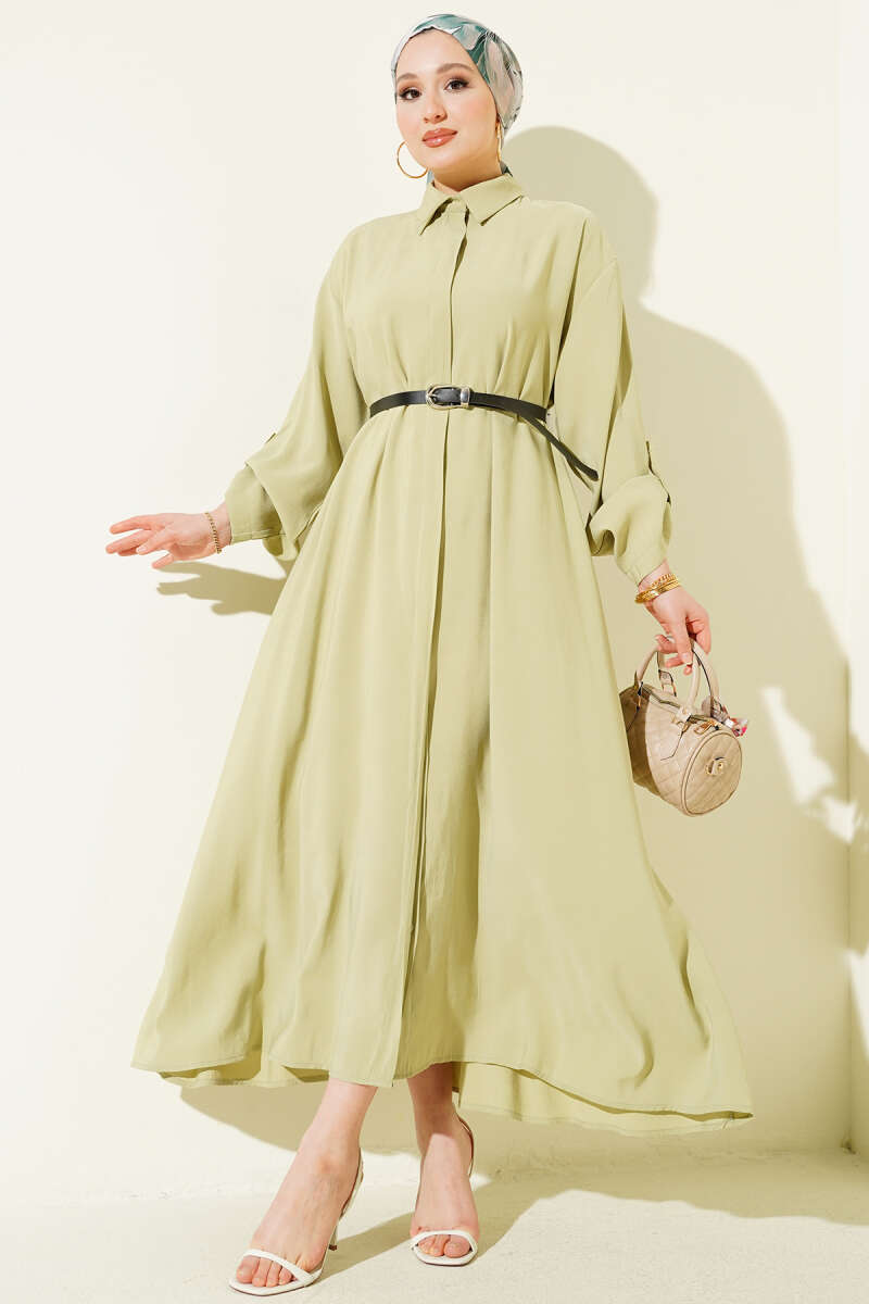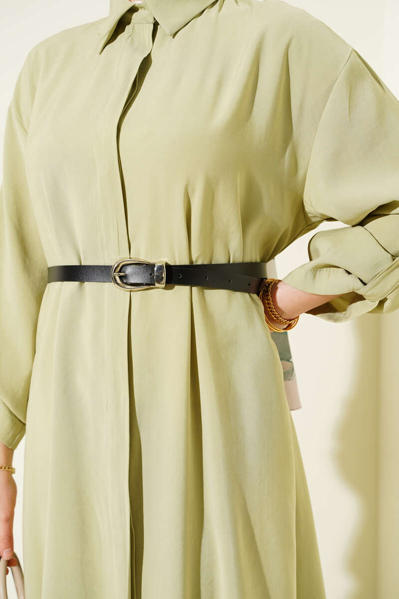 Boydan Düğmeli Kemerli Basic Elbise Çağla Yeşili