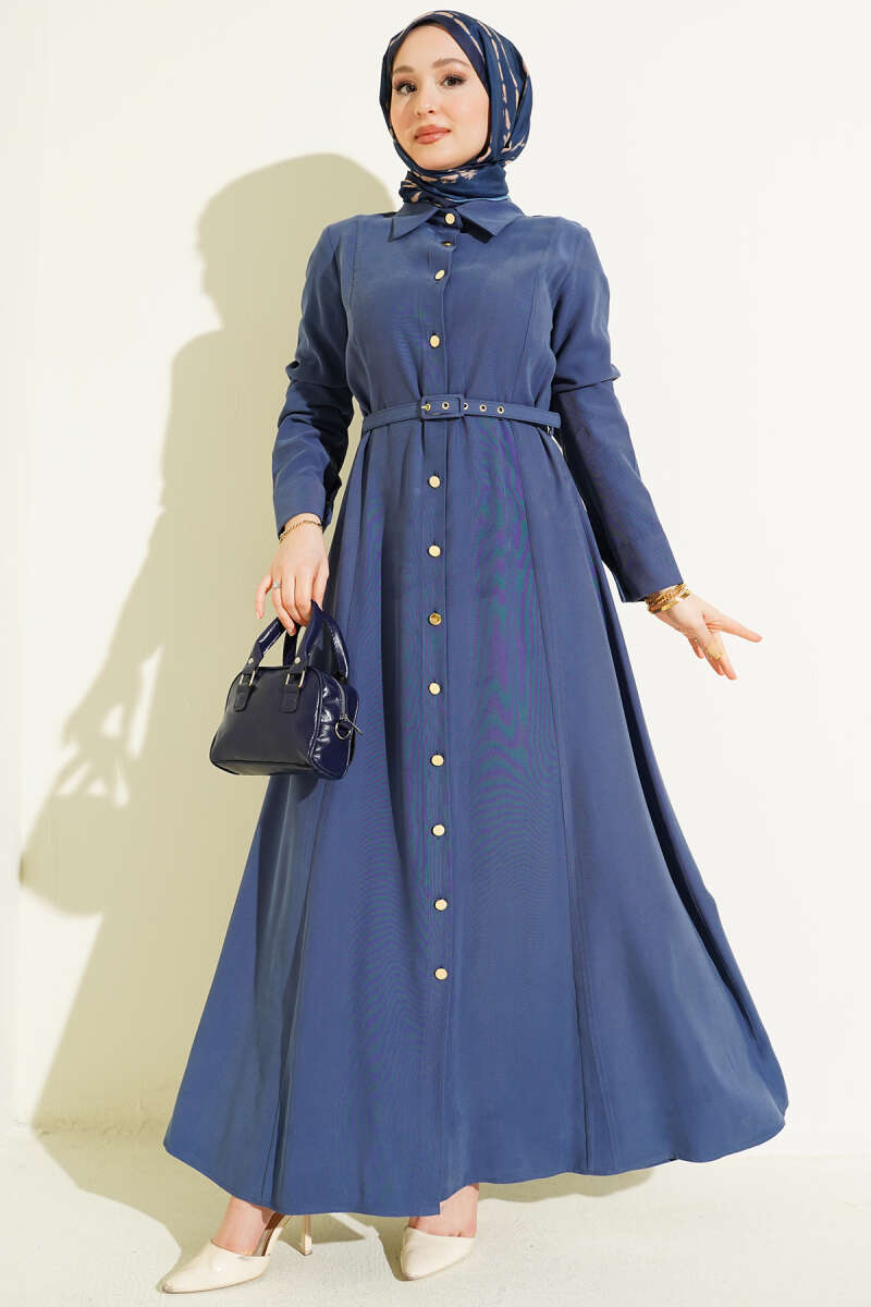 Boydan Düğmeli Kemerli Tensel Elbise Vizon
