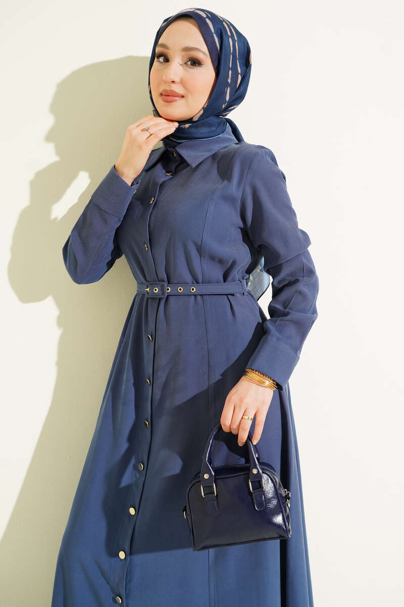 Boydan Düğmeli Kemerli Tensel Elbise Taş