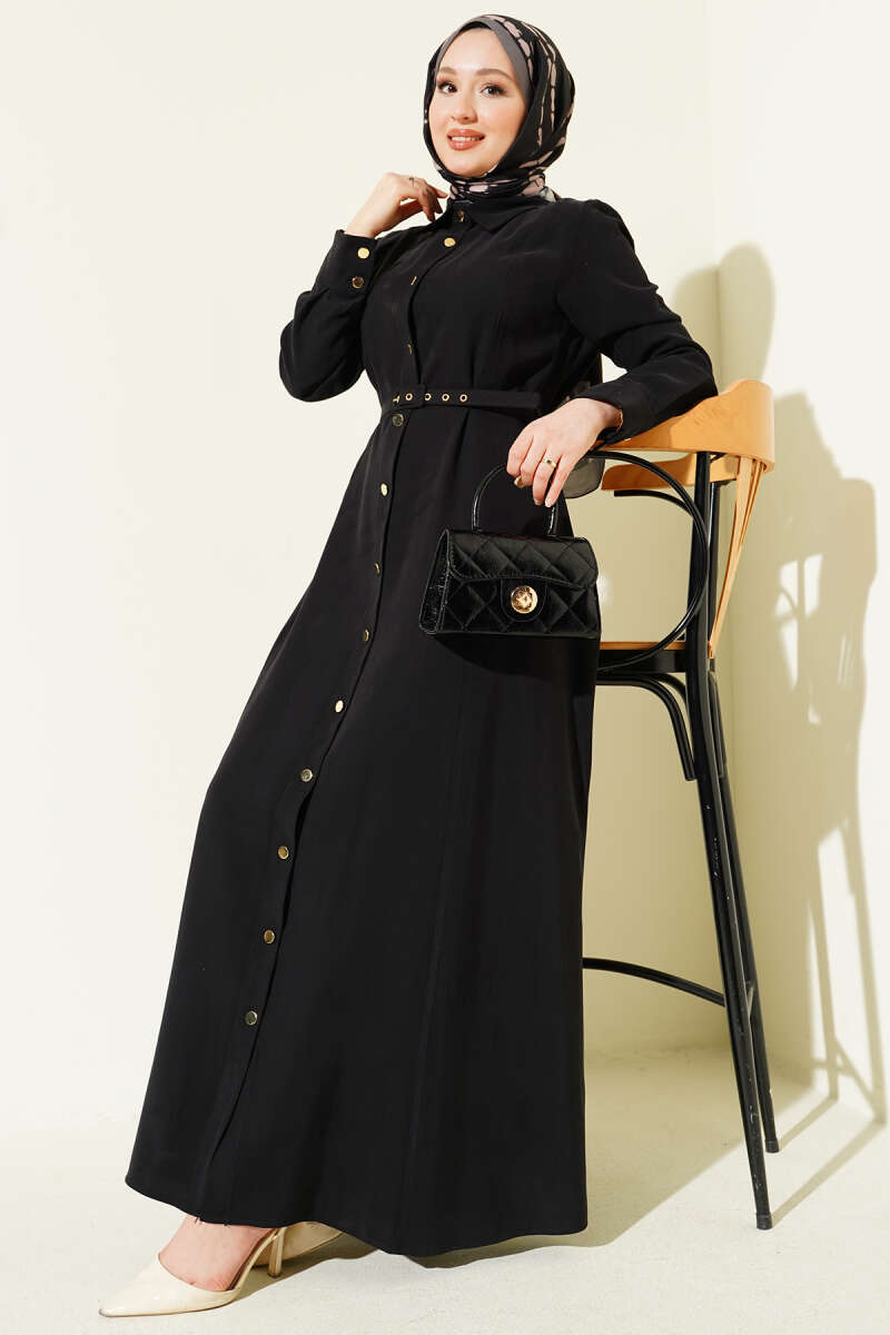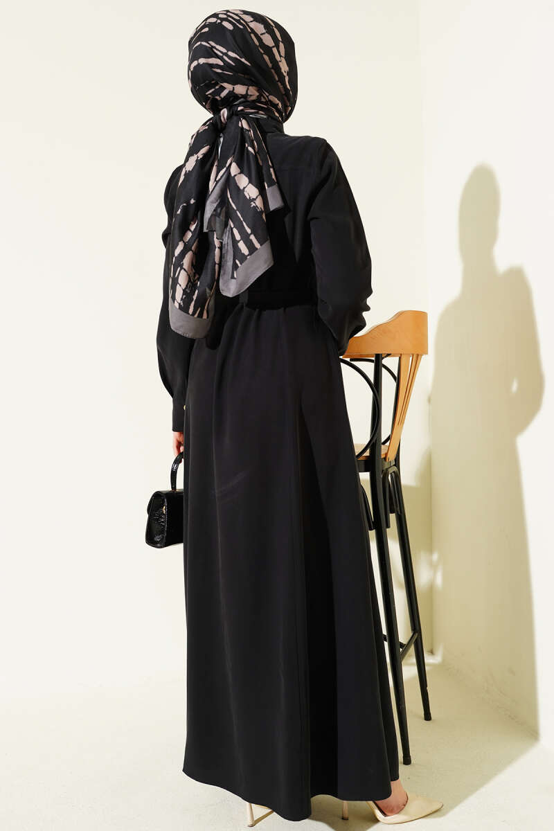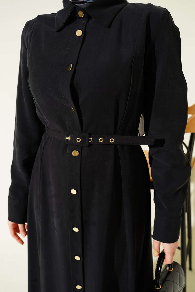 Boydan Düğmeli Kemerli Tensel Elbise Taş