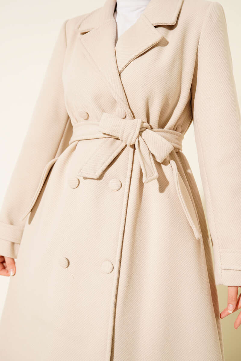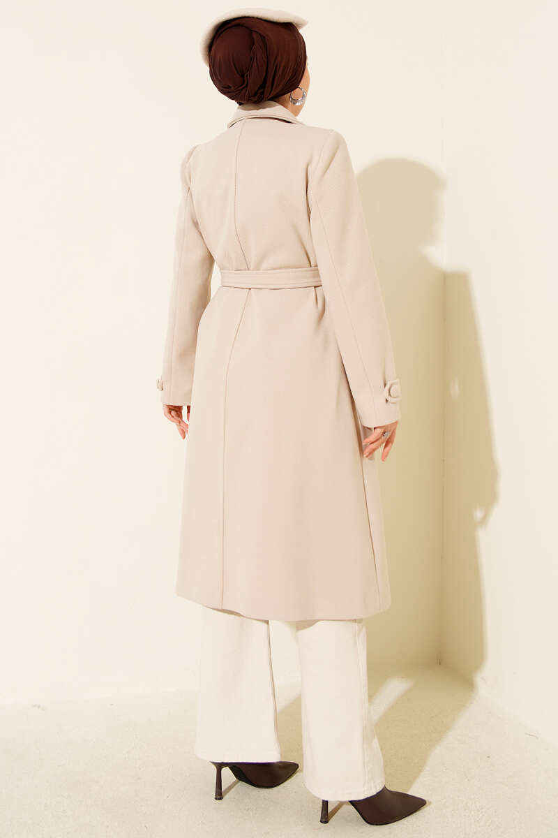 Kol Ribanalı Kuşaklı Tay Tüyü Kaban Bej