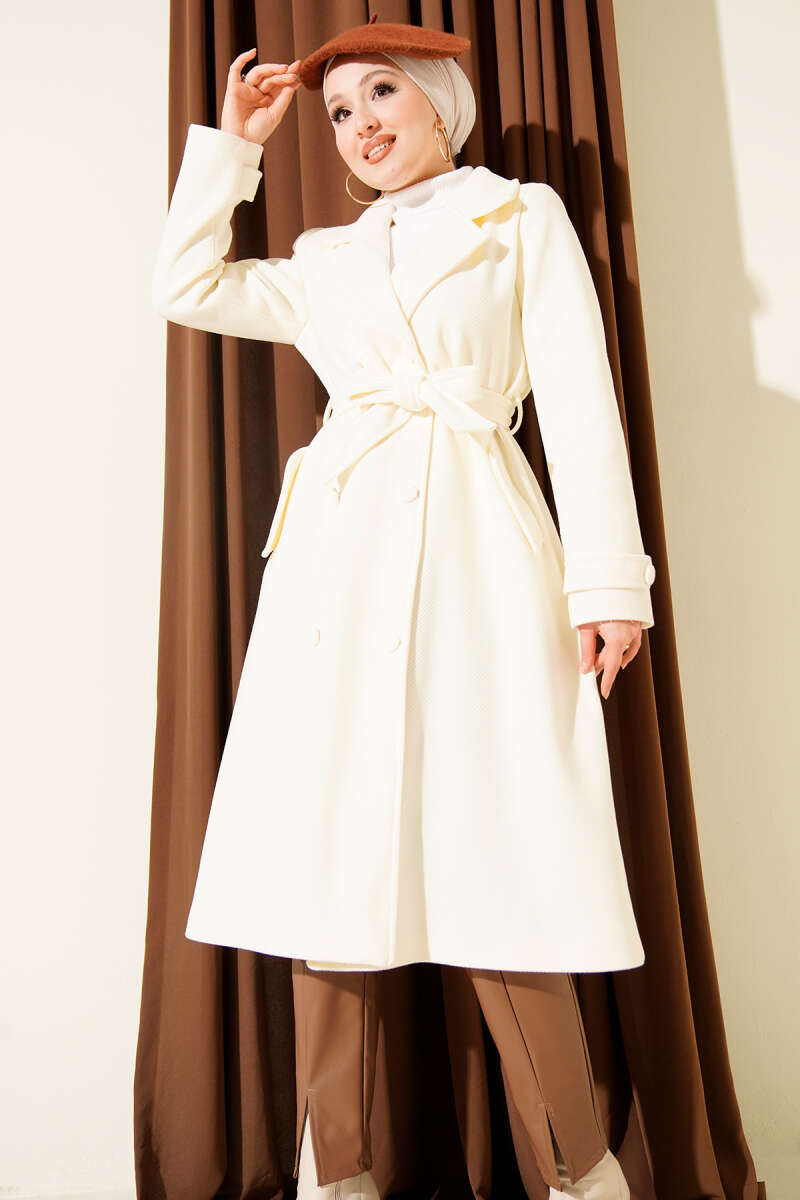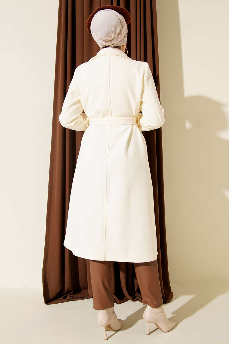 Kuşaklı Gold Düğmeli Kaşe Kaban Saks