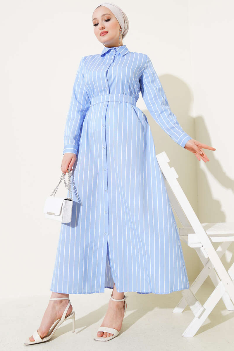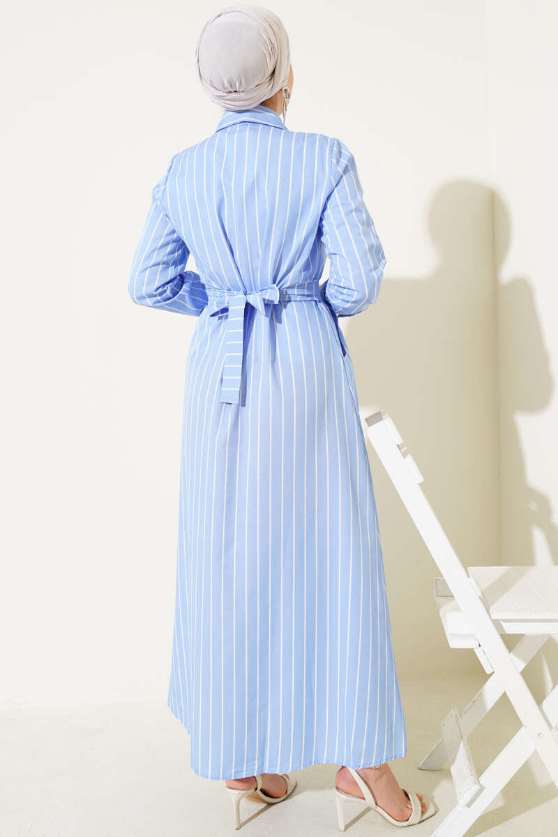 Boydan Düğmeli Kuşaklı Çizgili Elbise Buz Mavisi