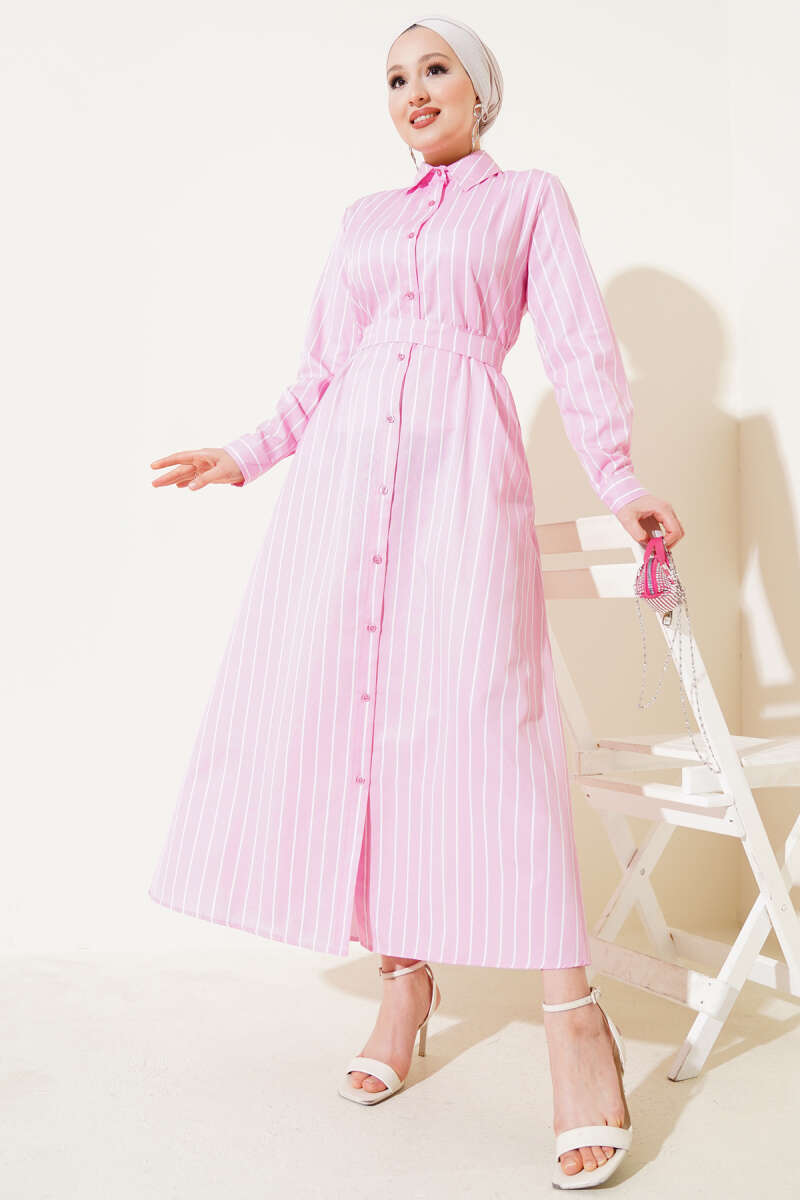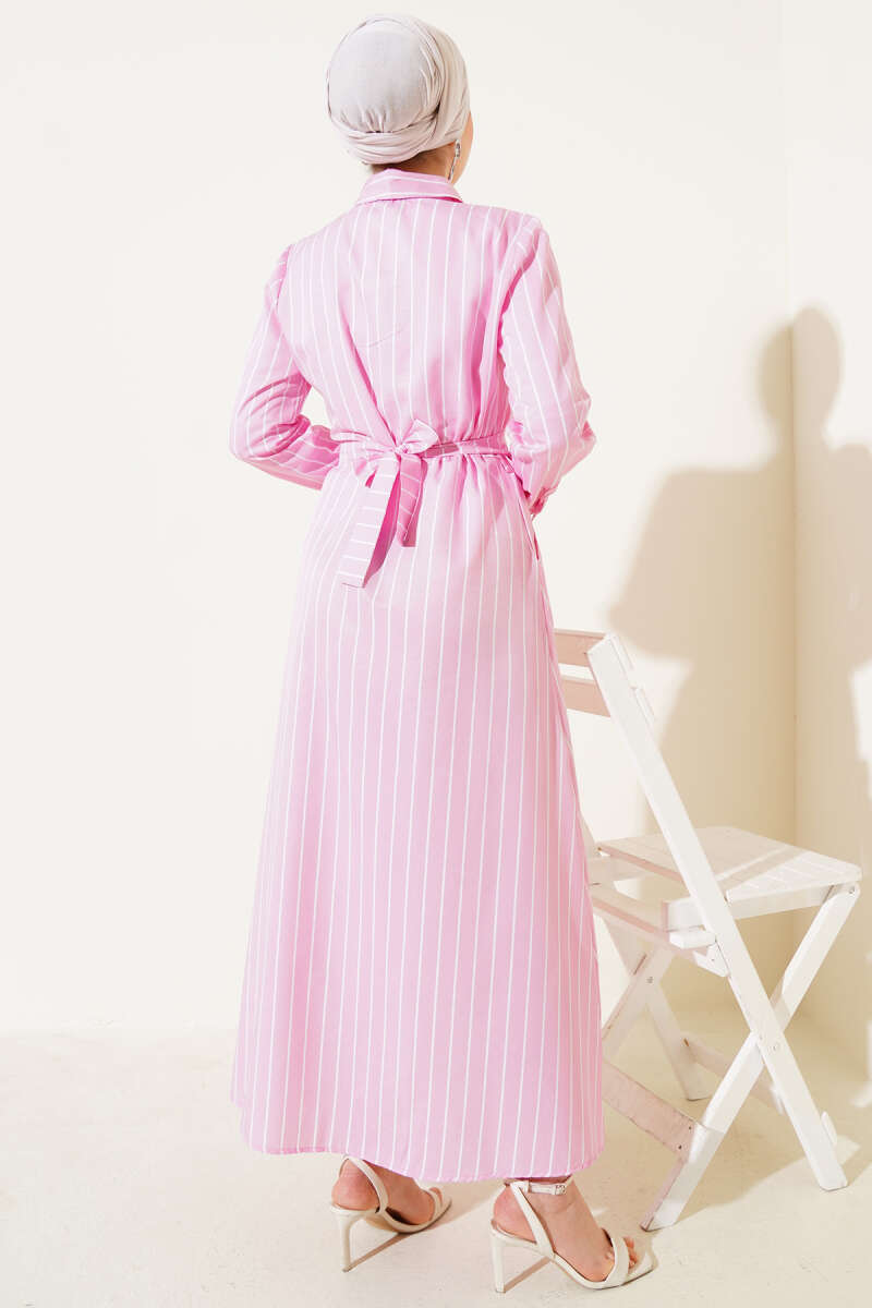Boydan Düğmeli Kuşaklı Çizgili Elbise Pembe
