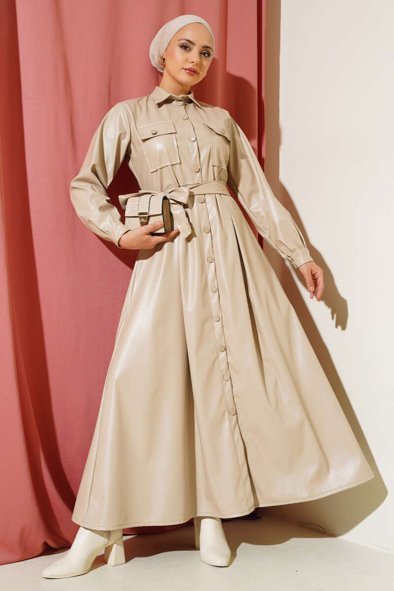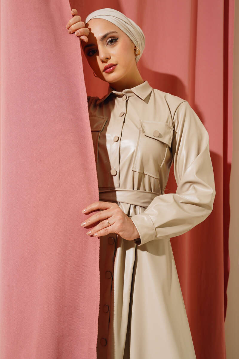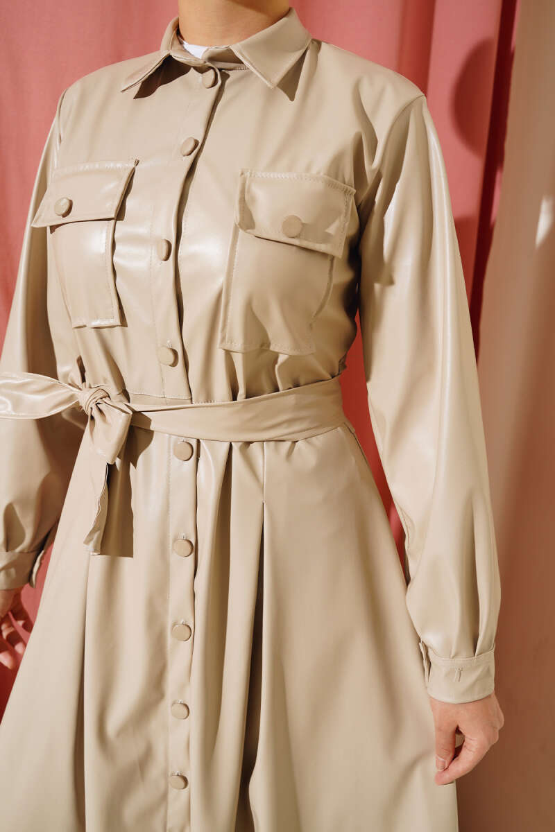 Çizgi Gömlek Garnili Triko Elbise Bej