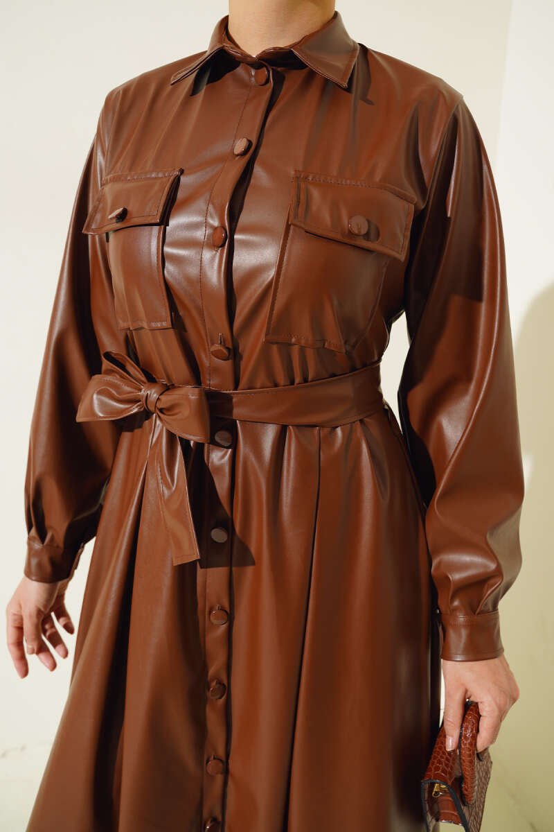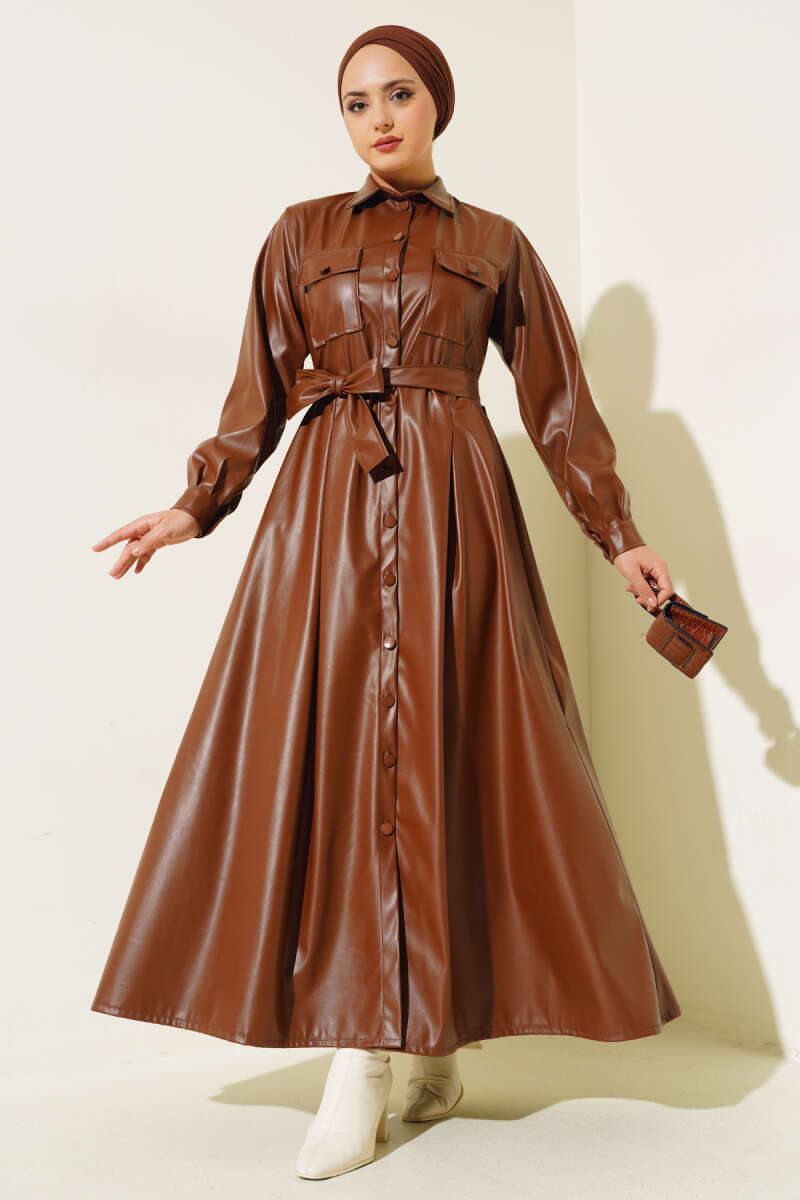 Çizgi Gömlek Garnili Triko Elbise Kahve