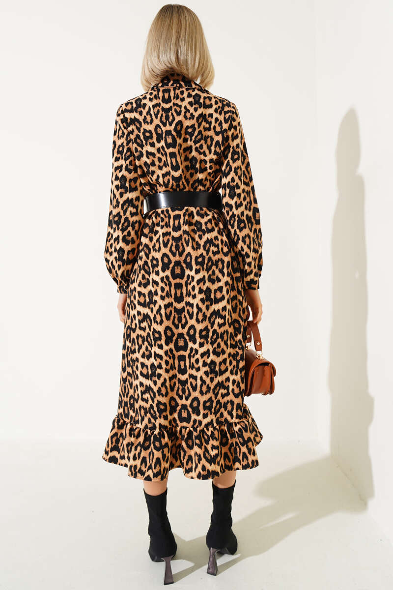 Boydan Düğmeli Leopar Desen Midi Elbise Camel