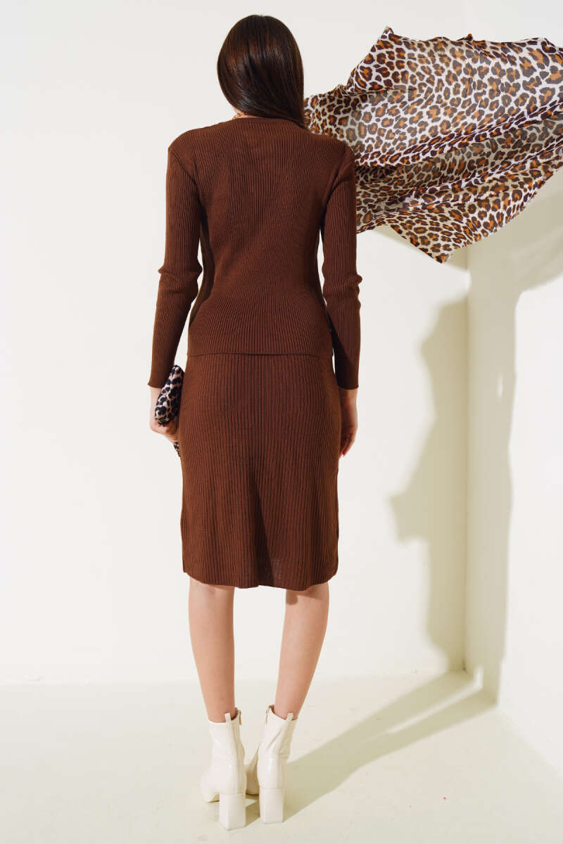 Boydan Düğmeli Midi Etekli Fitilli Triko Takım Kahve