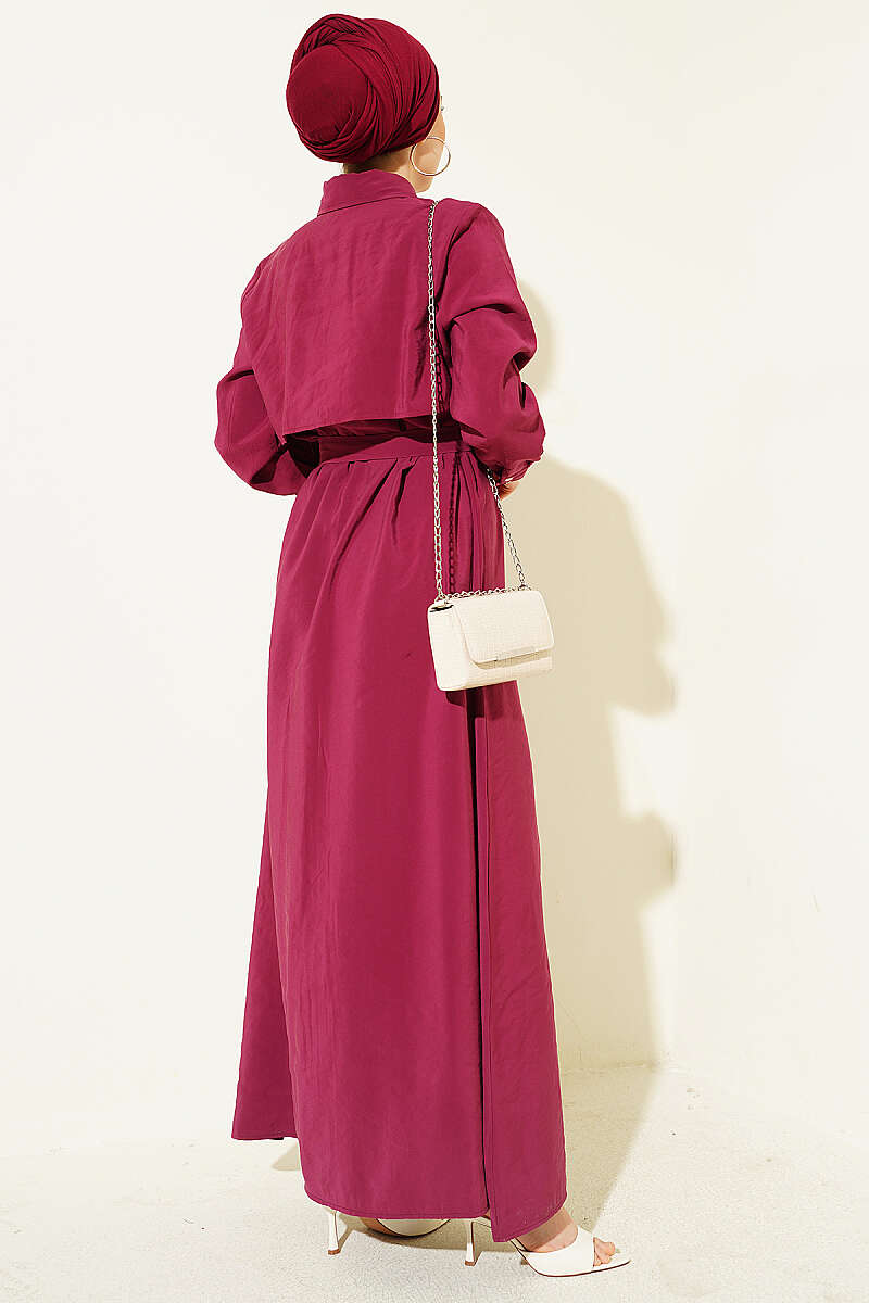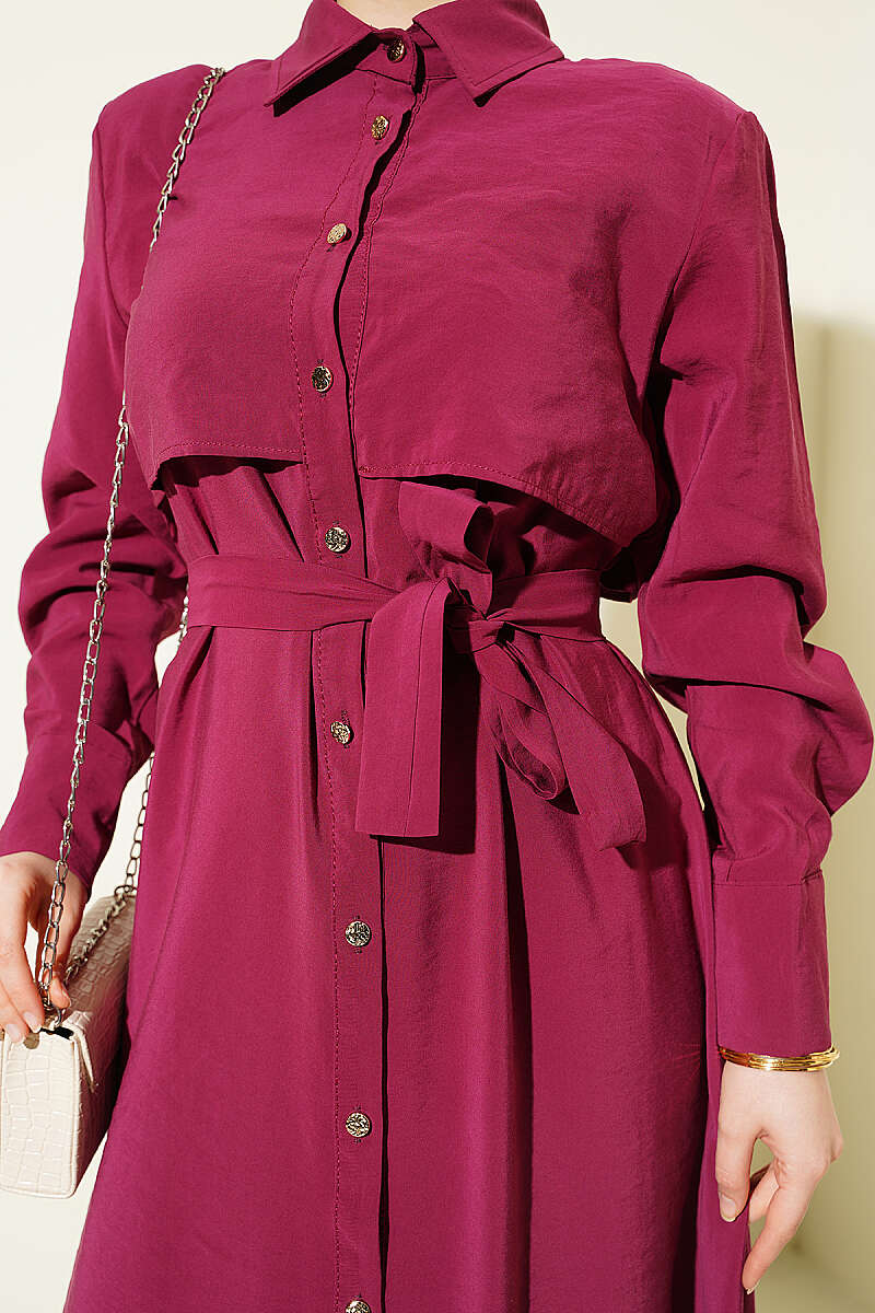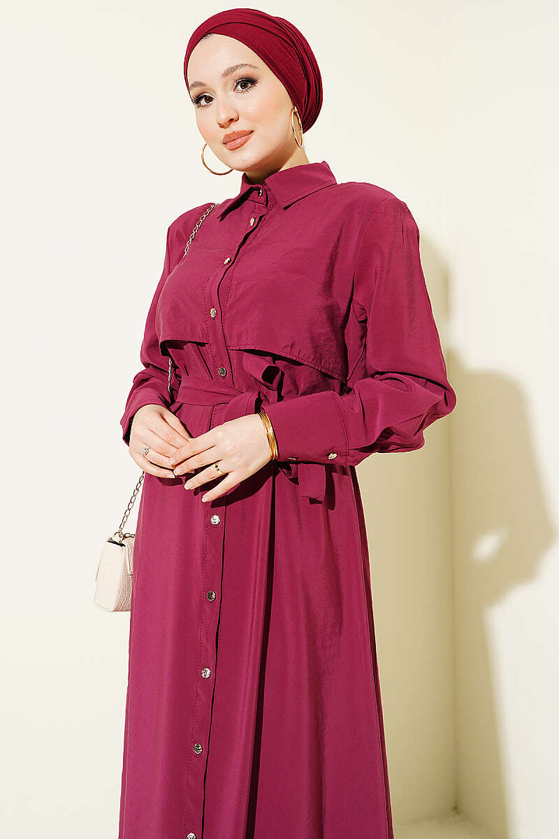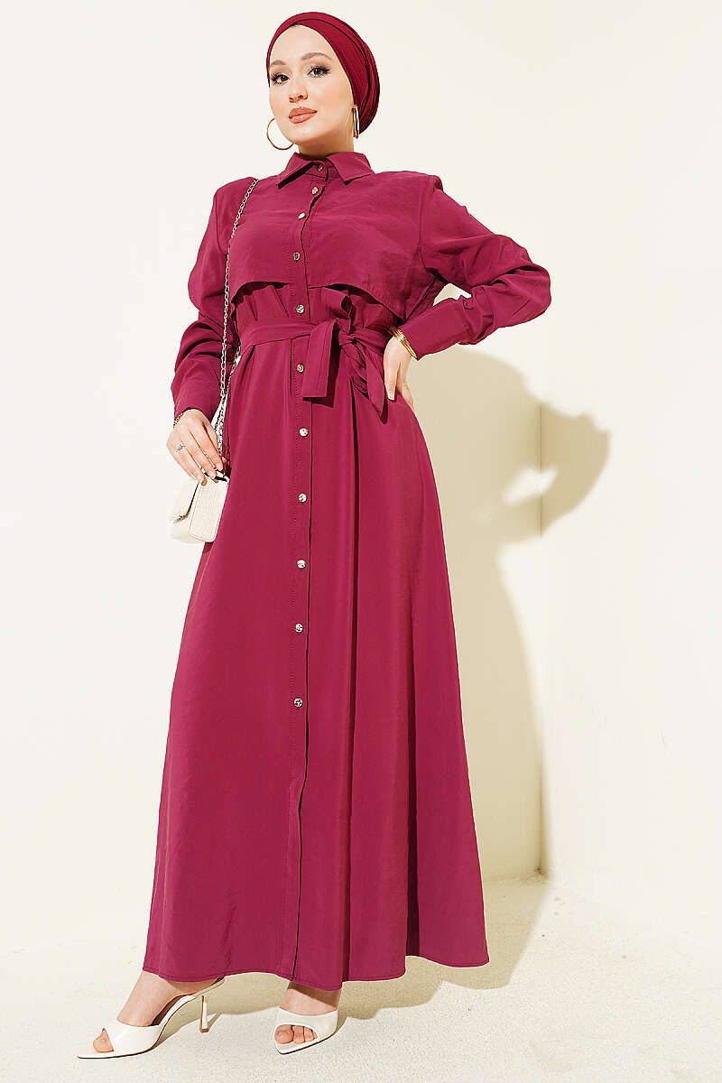 Boydan Düğmeli Parça Detaylı Kuşaklı Elbise Bordo