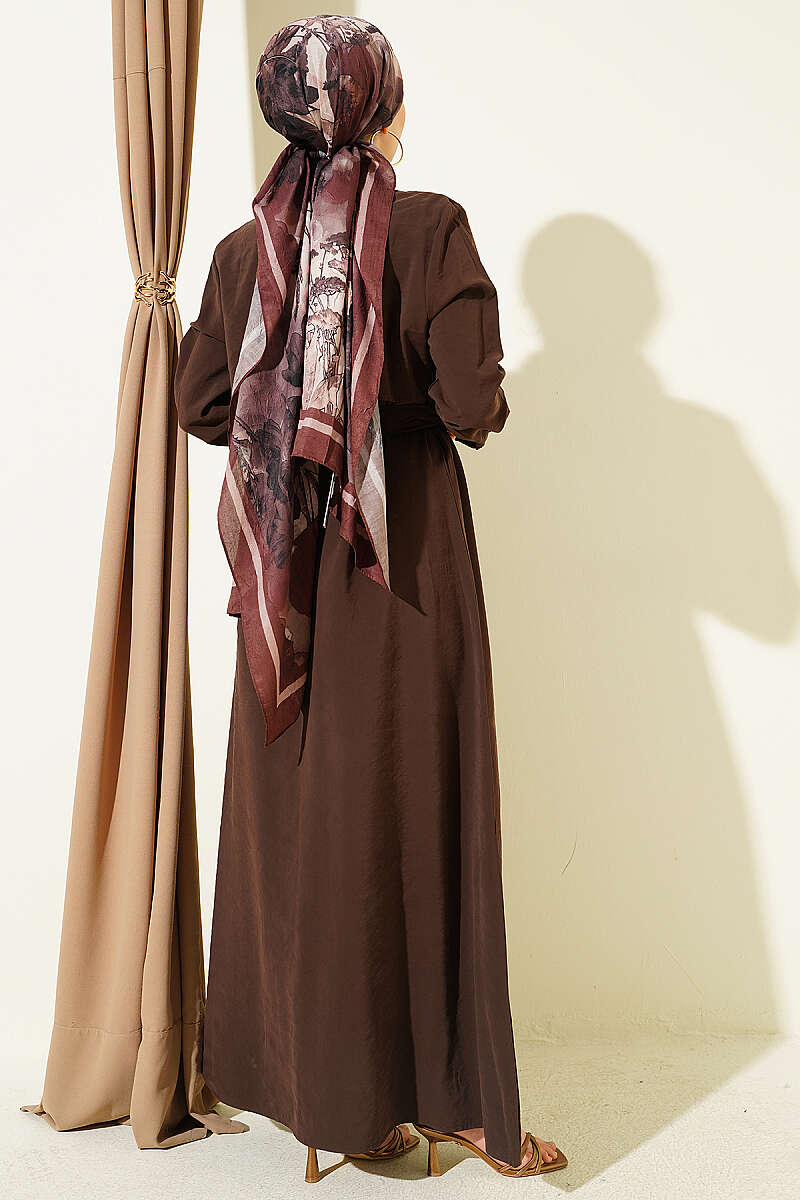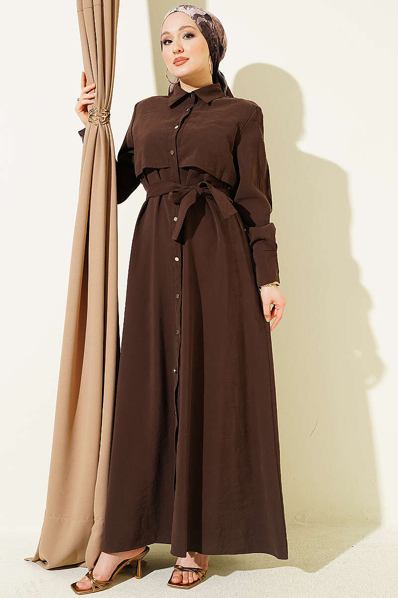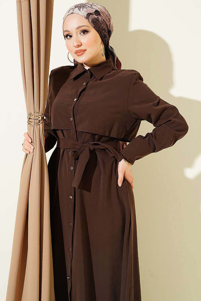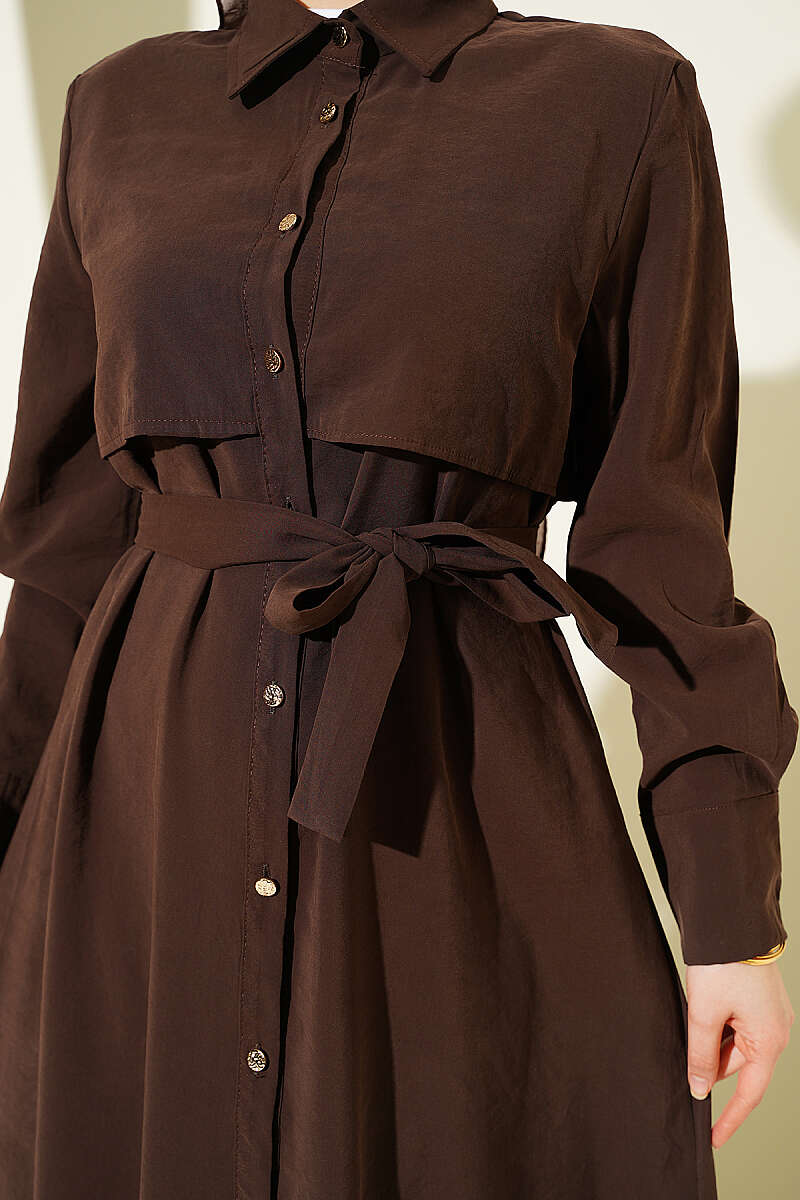 Boydan Düğmeli Parça Detaylı Kuşaklı Elbise Kahve