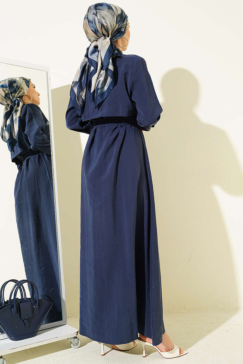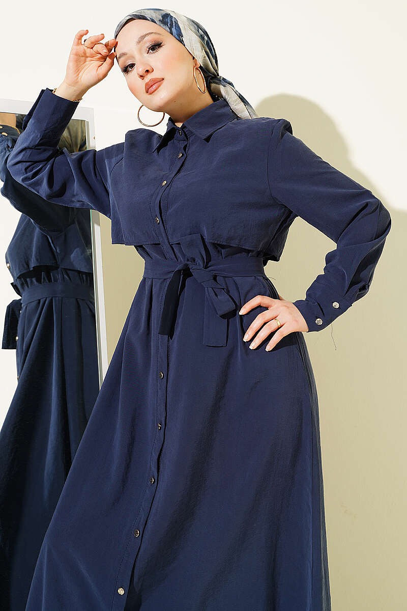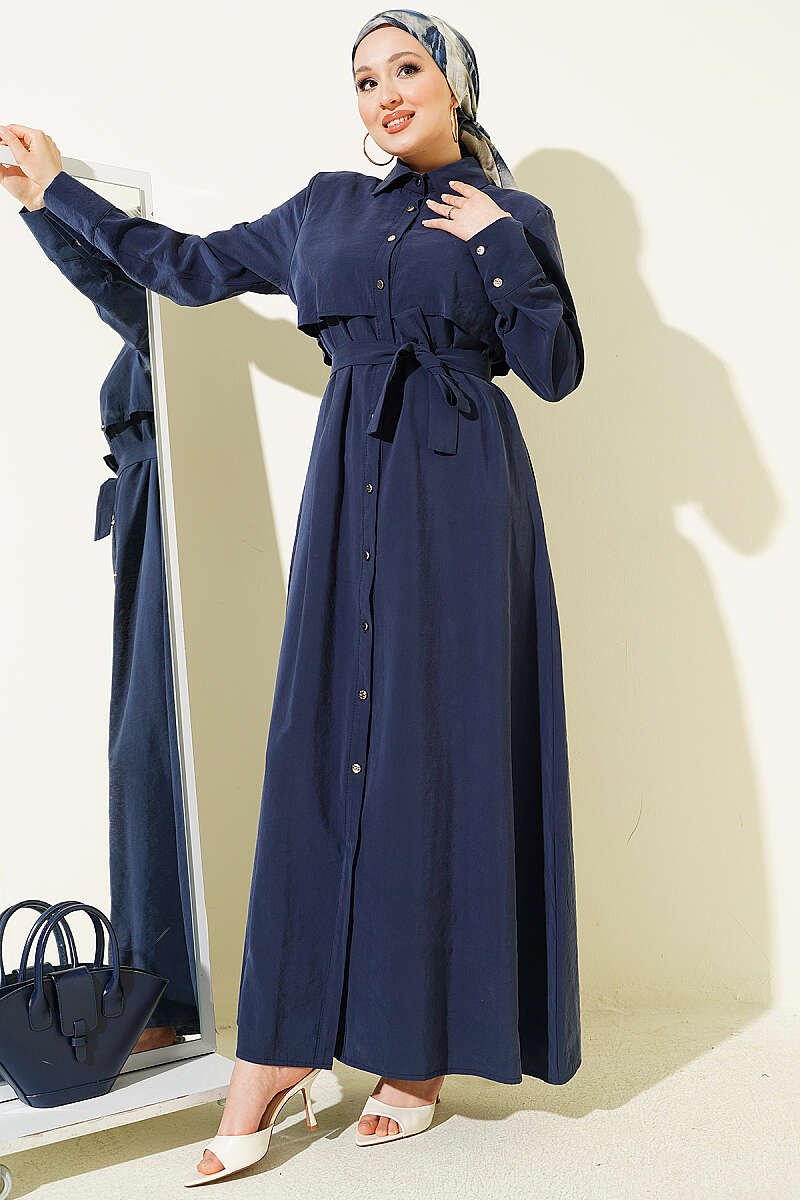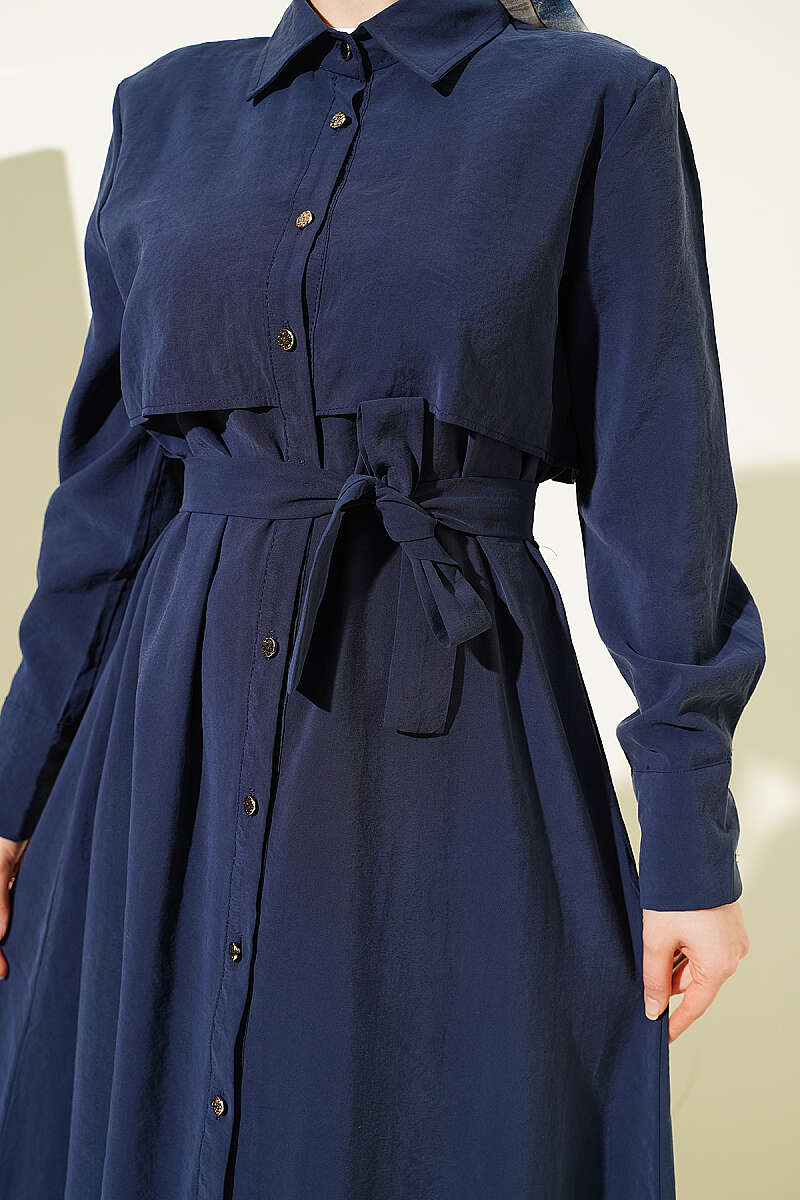 Boydan Düğmeli Parça Detaylı Kuşaklı Elbise Lacivert