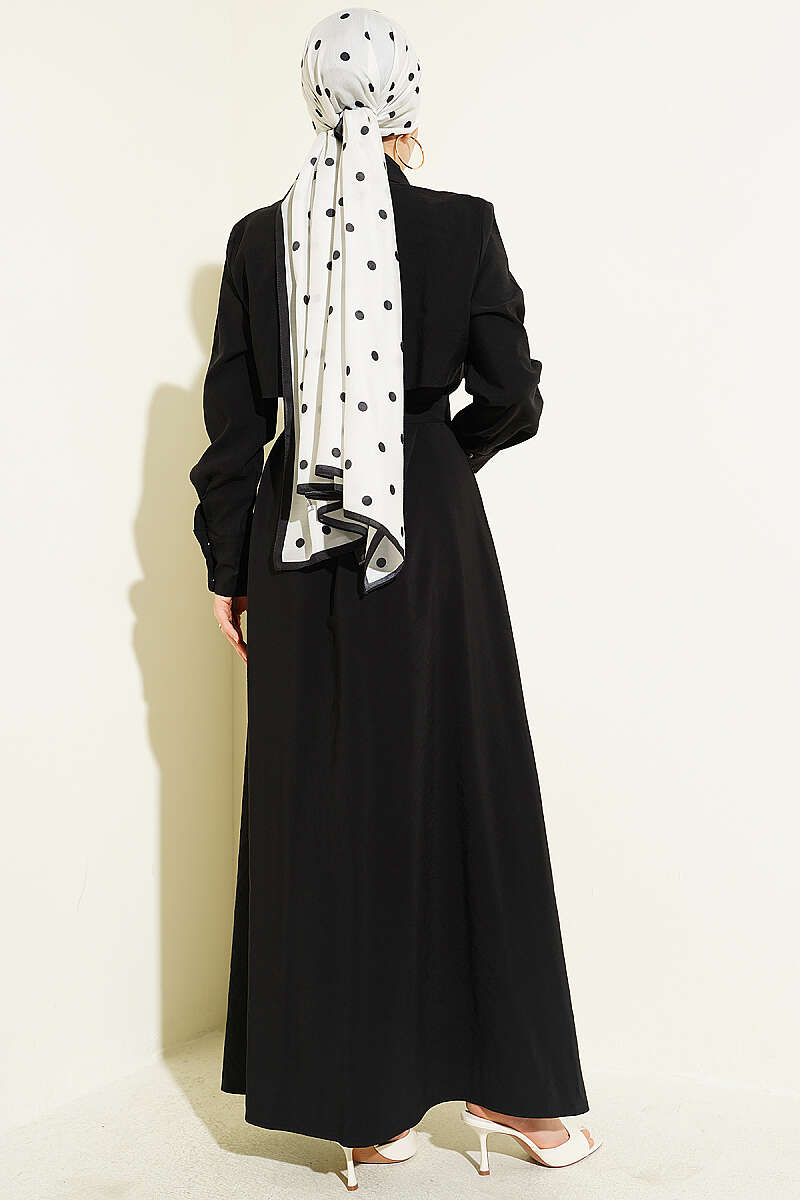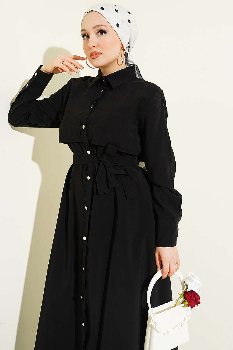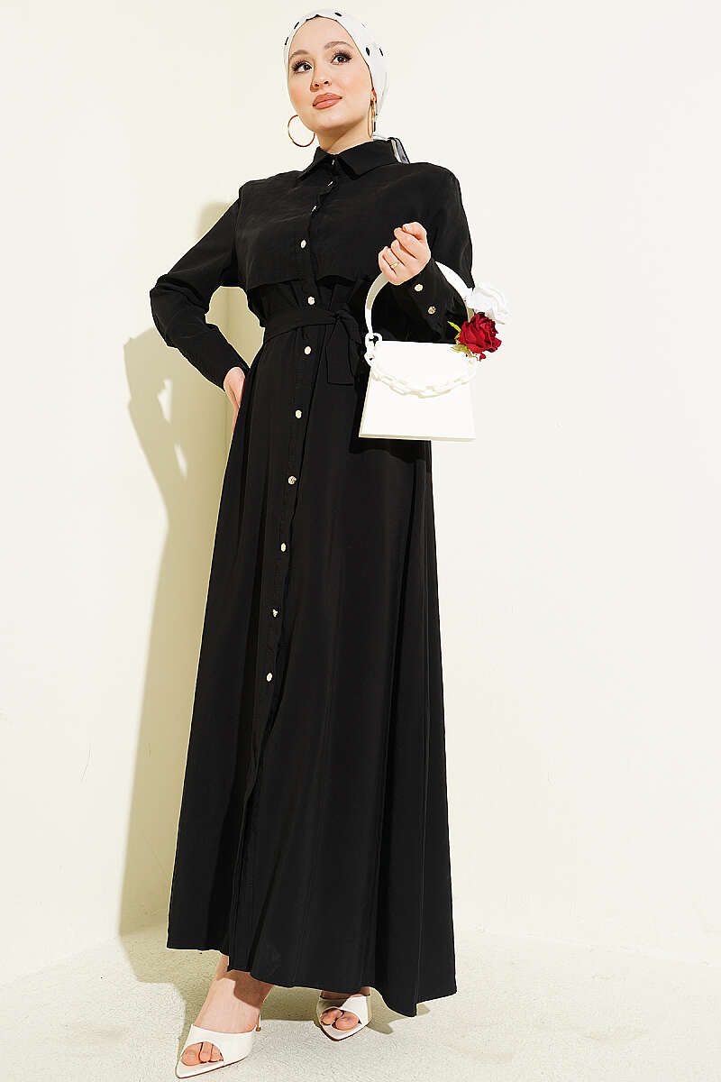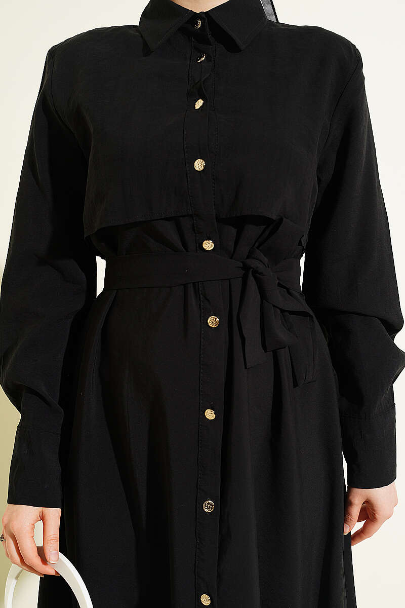 Boydan Düğmeli Parça Detaylı Kuşaklı Elbise Siyah