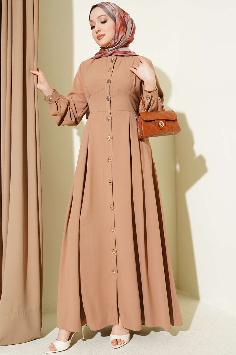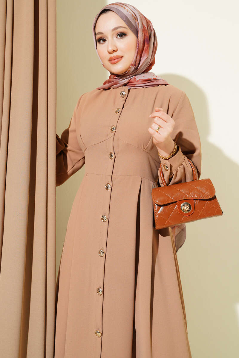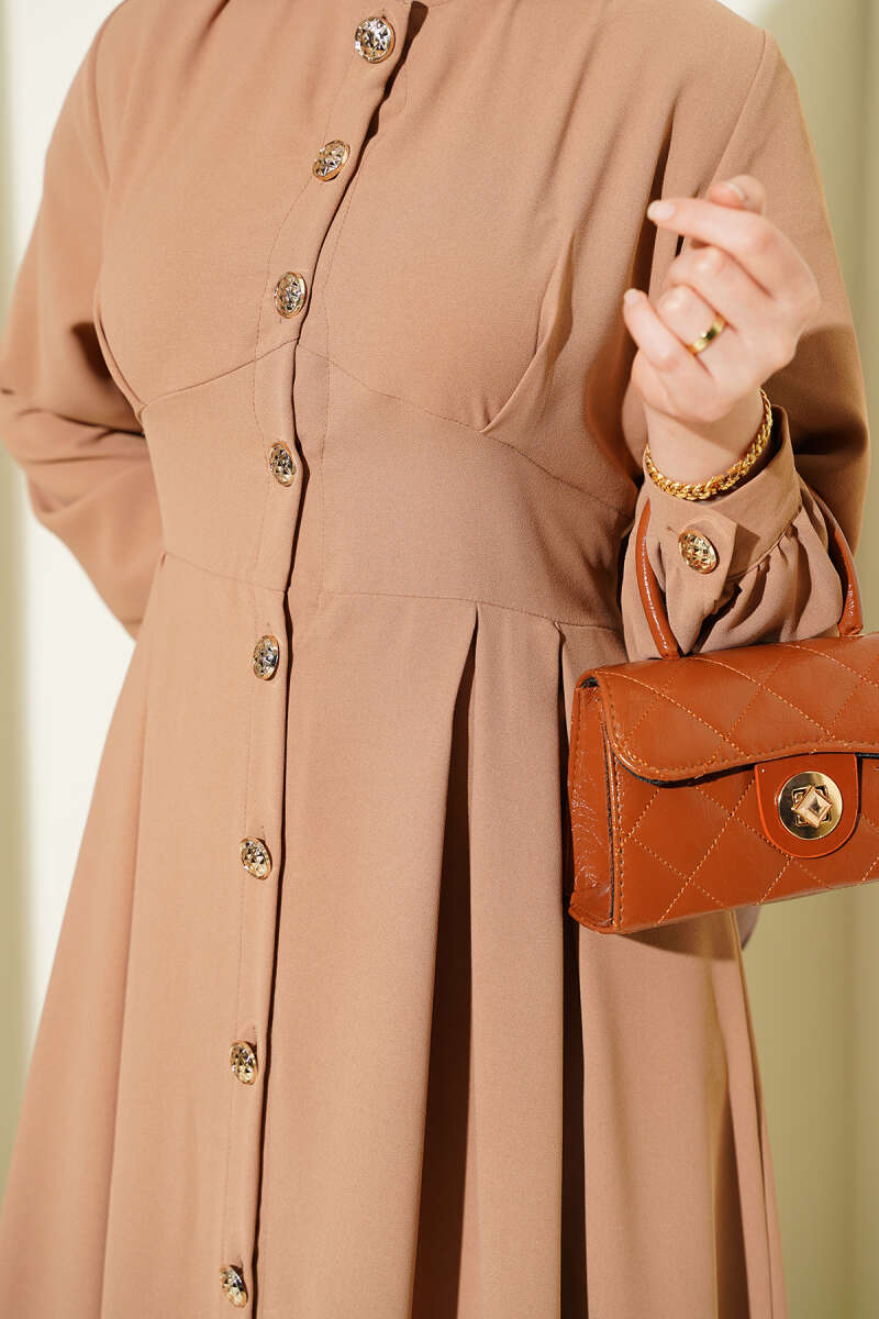 Boydan Düğmeli Pensli Elbise Kum Bej
