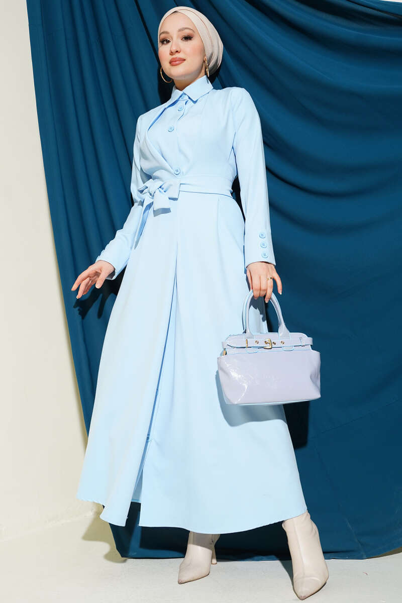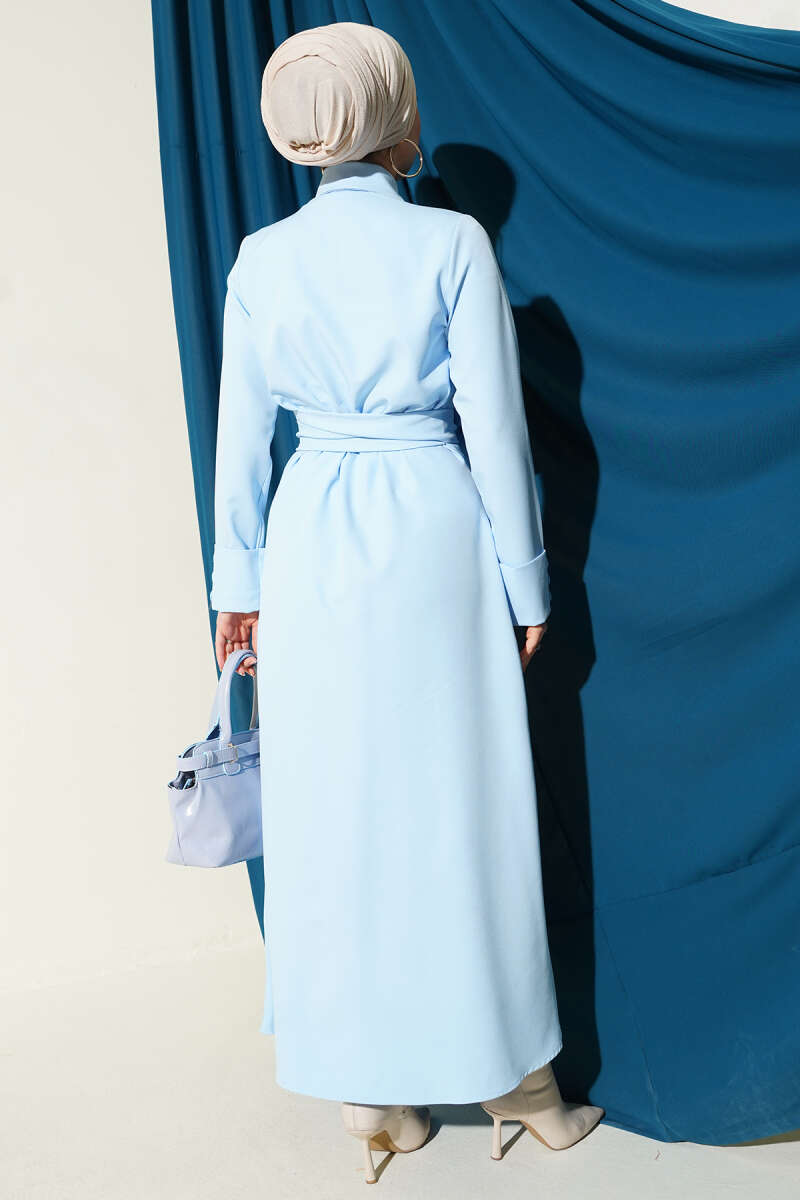 Boydan Düğmeli Pensli Kuşaklı Elbise Lacivert