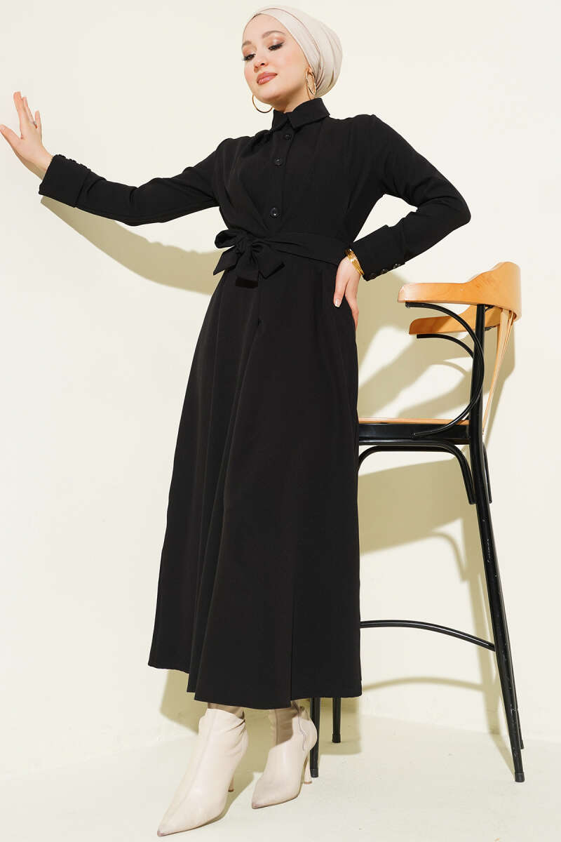 Boydan Düğmeli Pensli Kuşaklı Elbise Füme