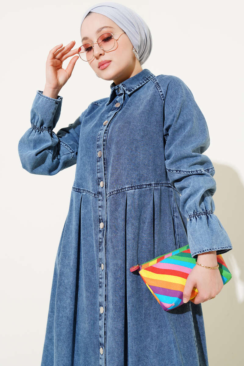 Kol Lastikli Metal Düğmeli Kot Elbise Kot