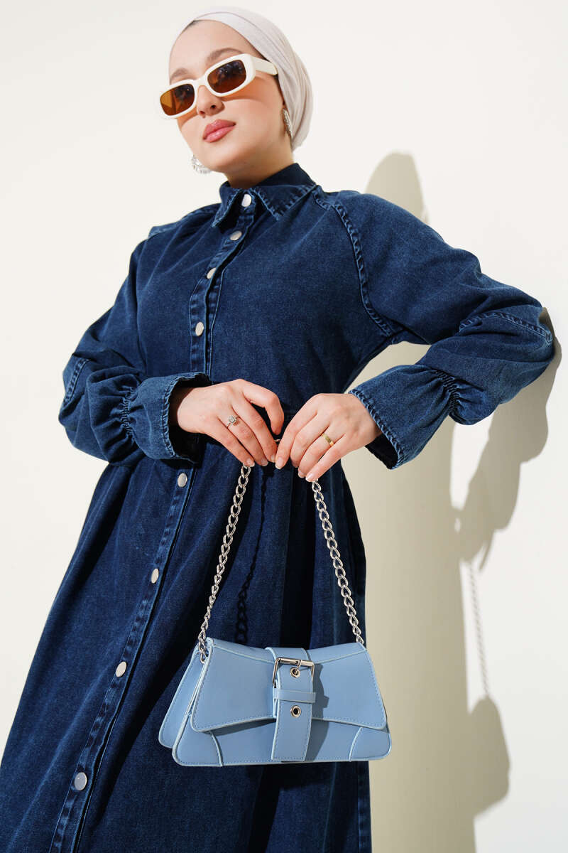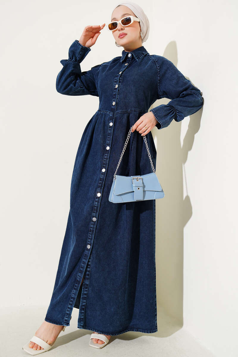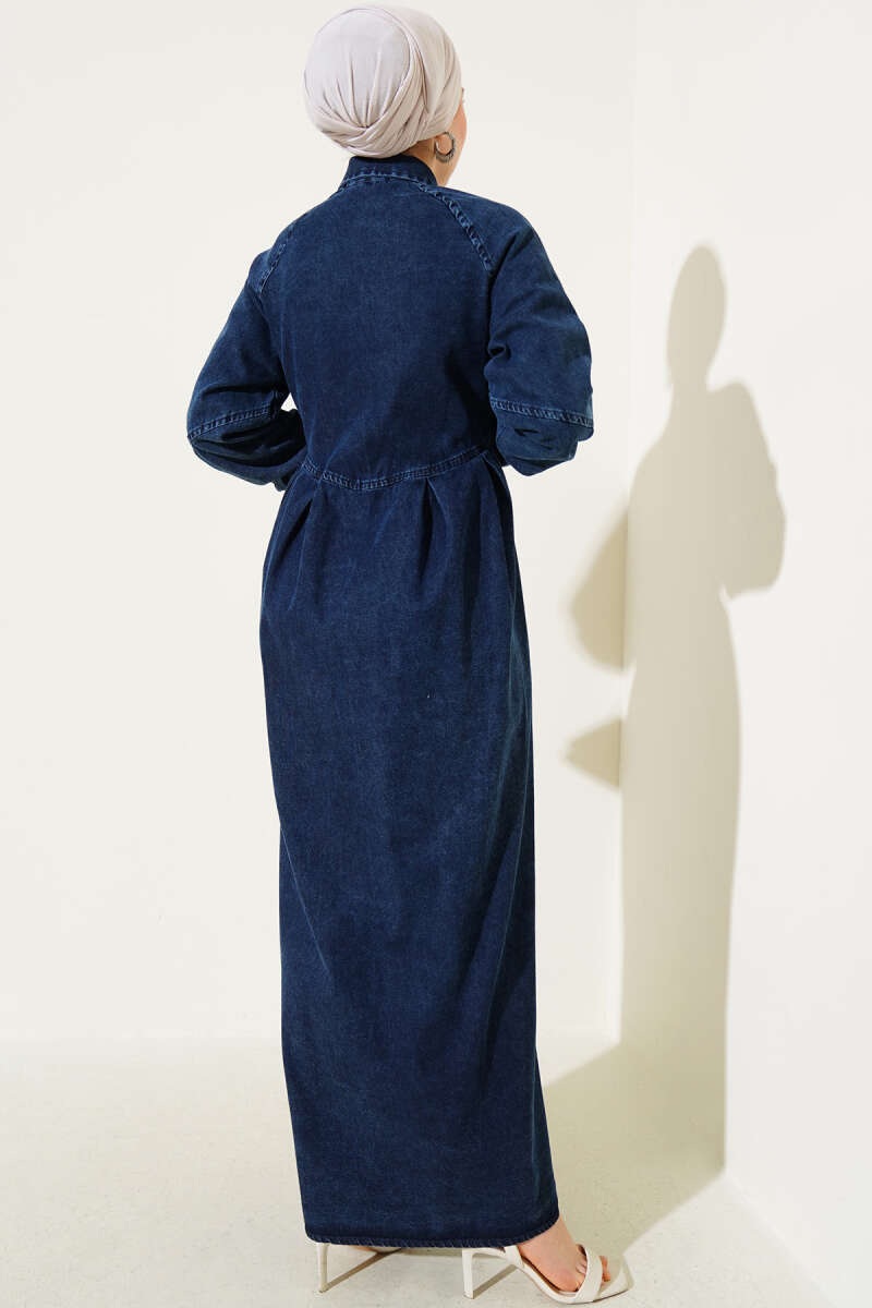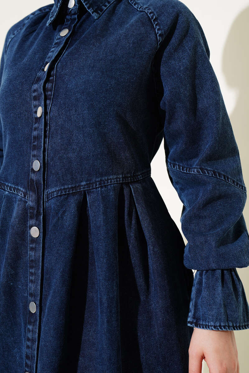 Düğmeli Hakim Yaka Kat Kot Elbise Kot Mavisi