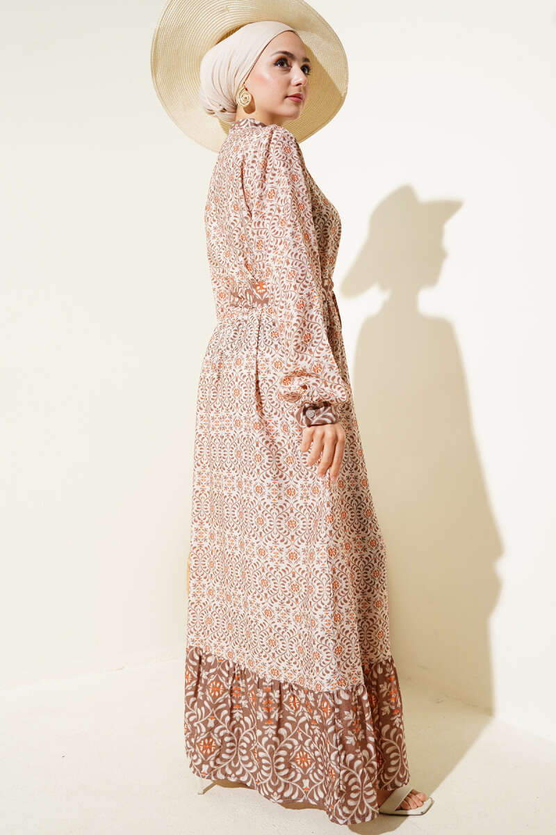 Boydan Düğmeli Retro Desen Elbise Kahve