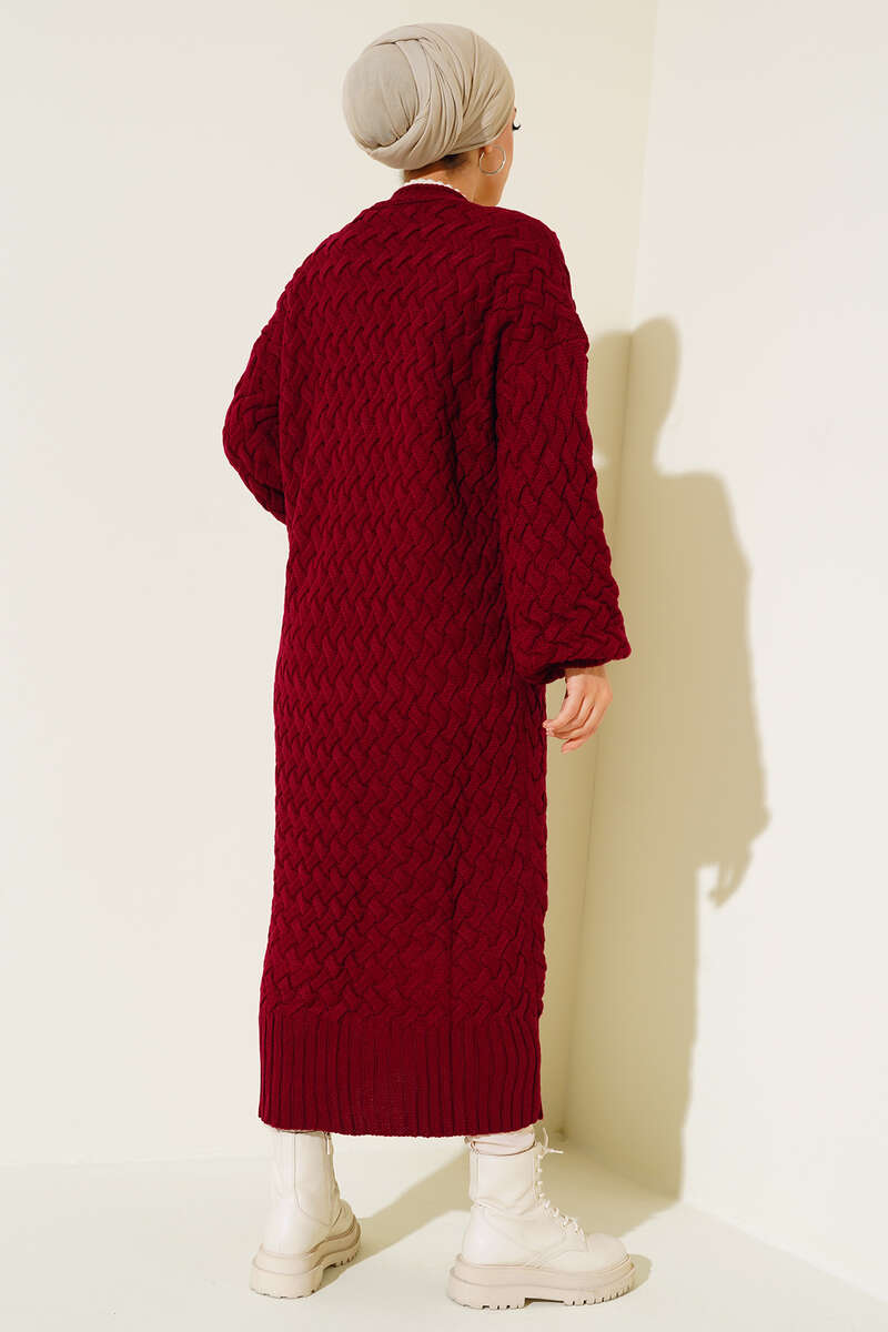Boydan Düğmeli Sepet Örgü Uzun Hırka Bordo
