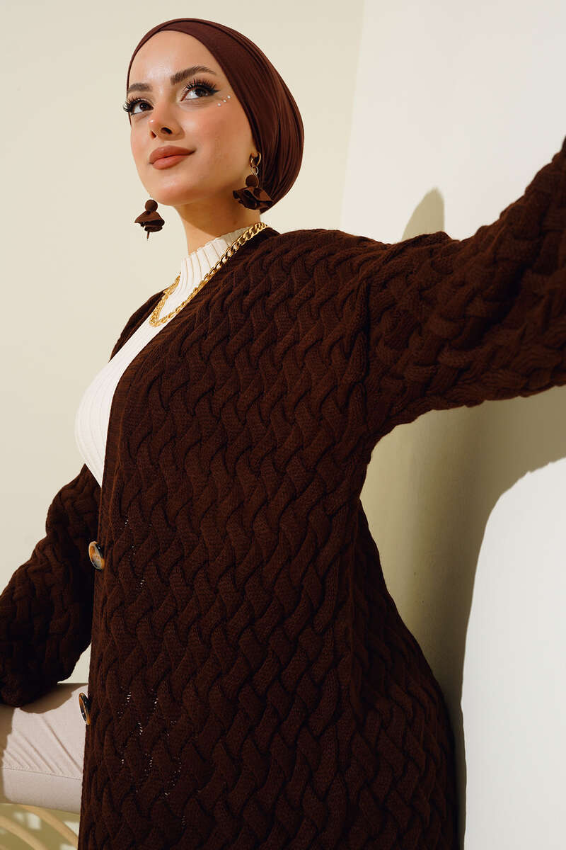 Boydan Düğmeli Sepet Örgü Uzun Hırka Kahve