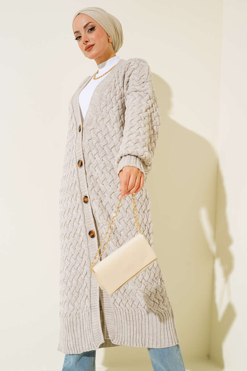 Yeni sezon uzun triko hırkamız şık duruşuyla özel seçilmiştir. Boydan düğmeli triko hırkamız sepet örgü modeldir. Düşük omuz model olan triko hırkmaızın bilekleri esnek yapısıyla dikkat çekmektedir.