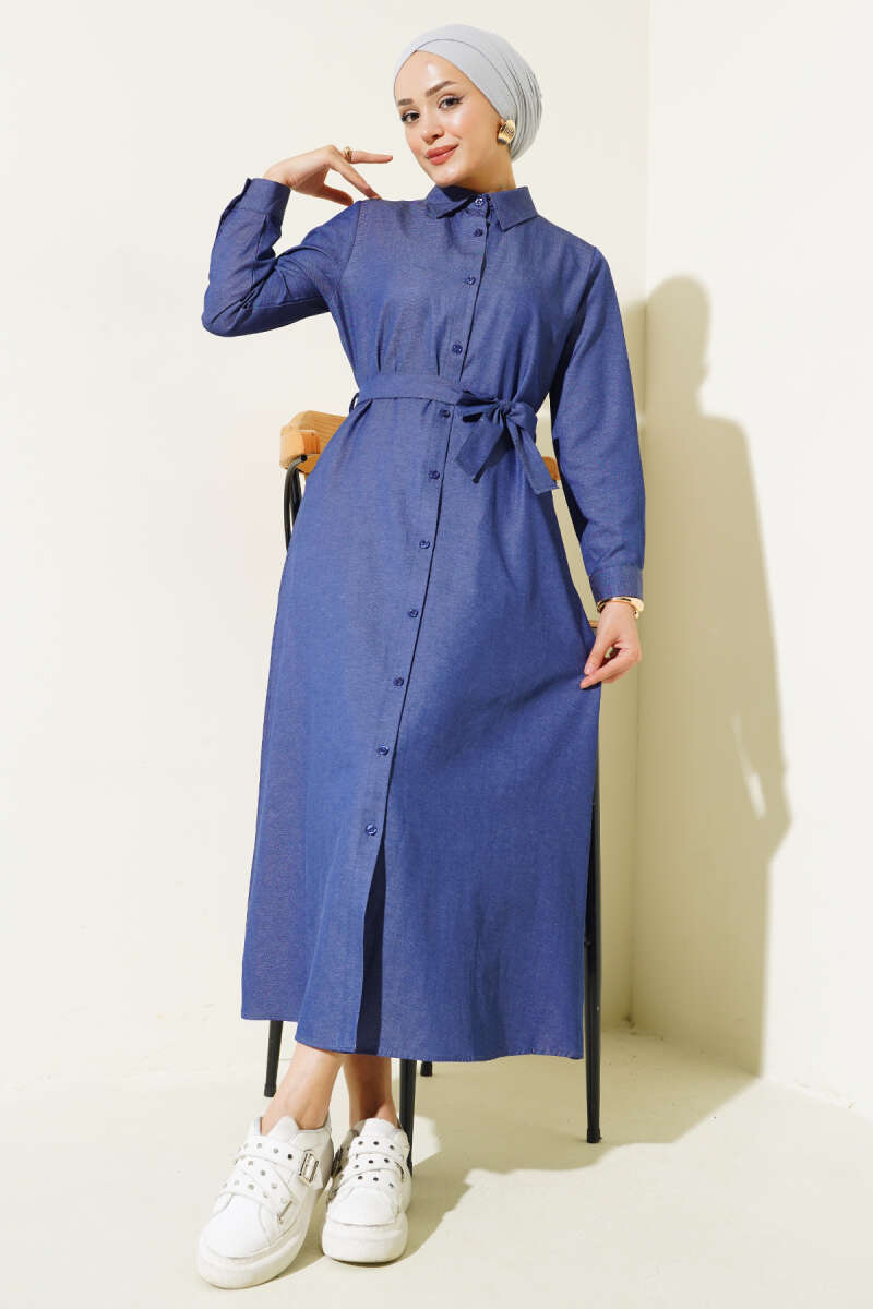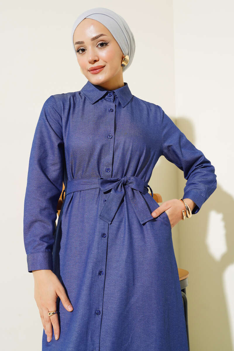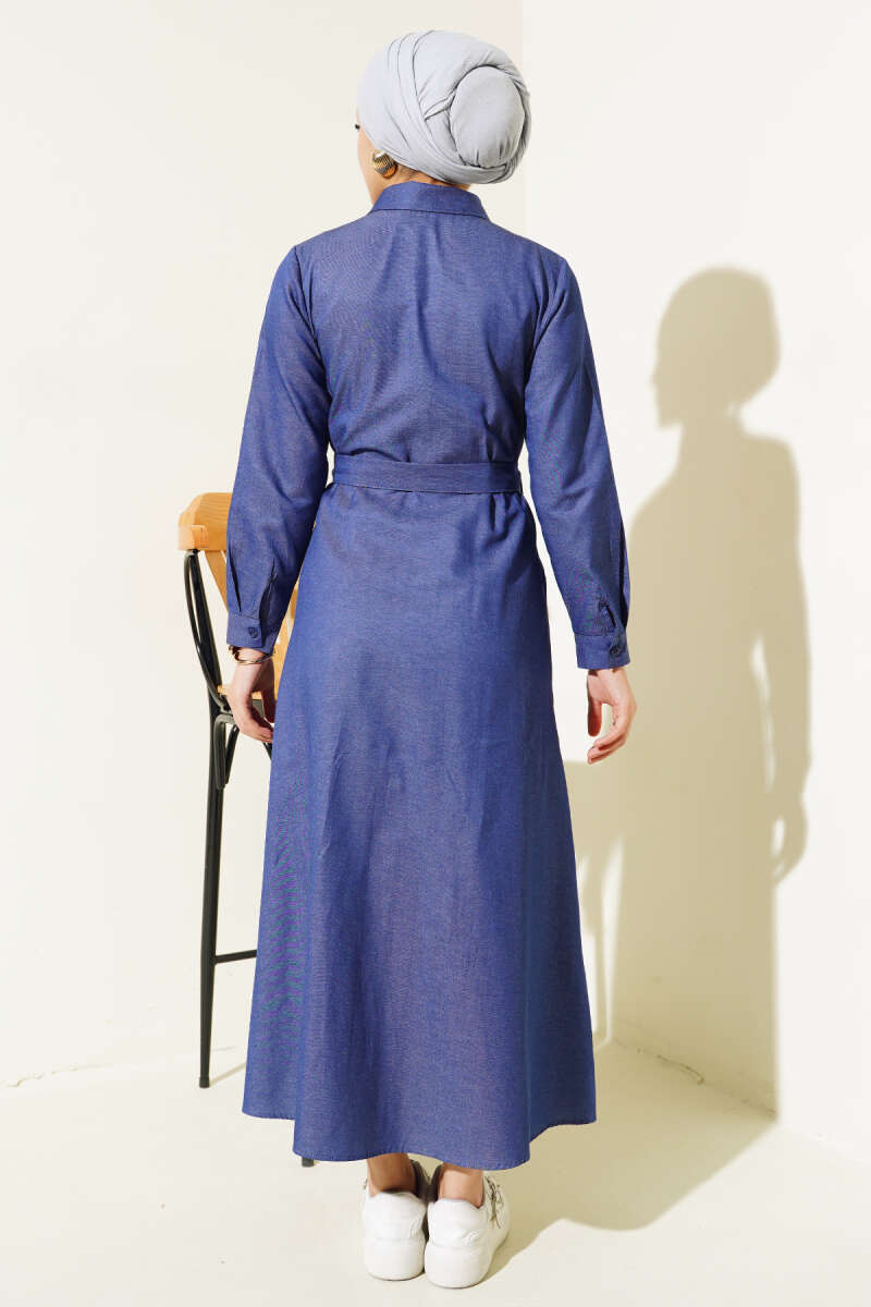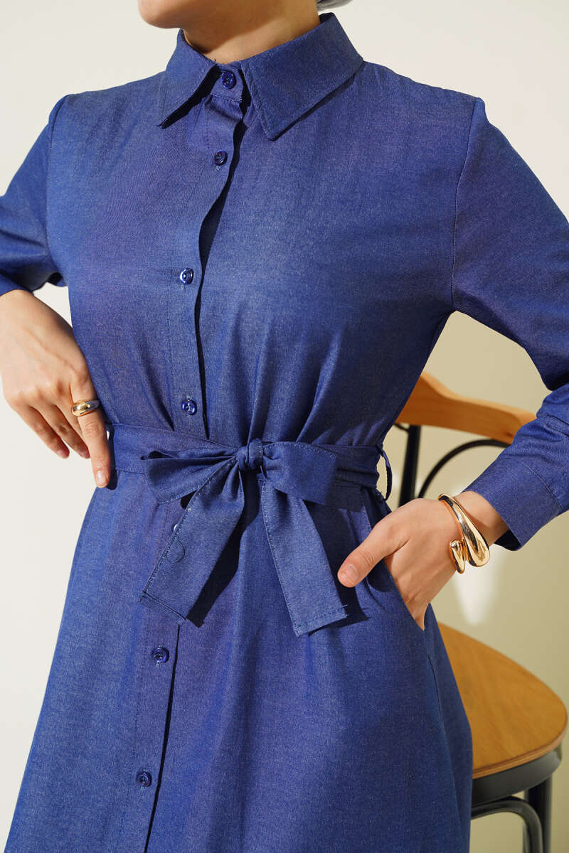 Boydan Düğmeli Tencel Kot Elbise İndigo
