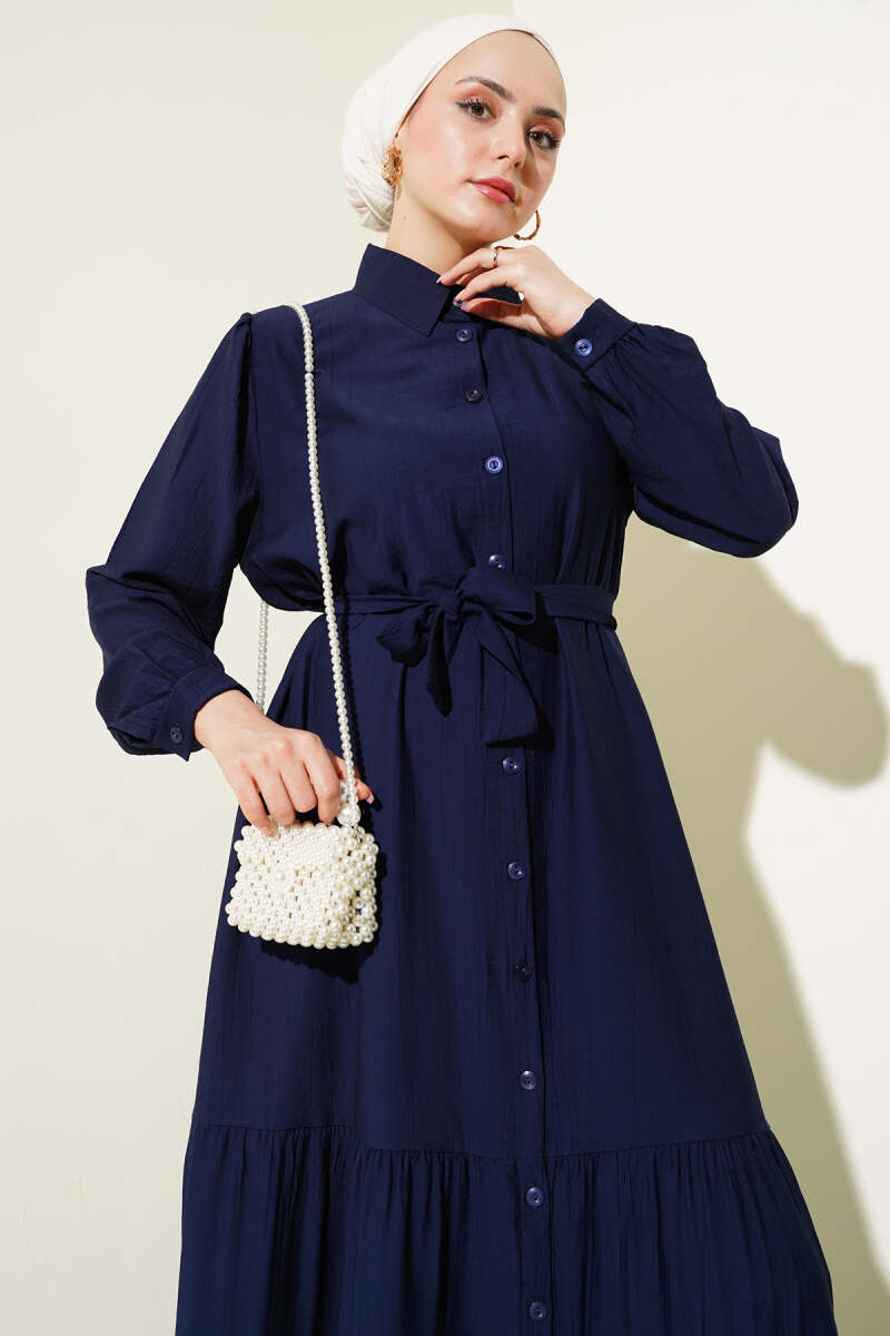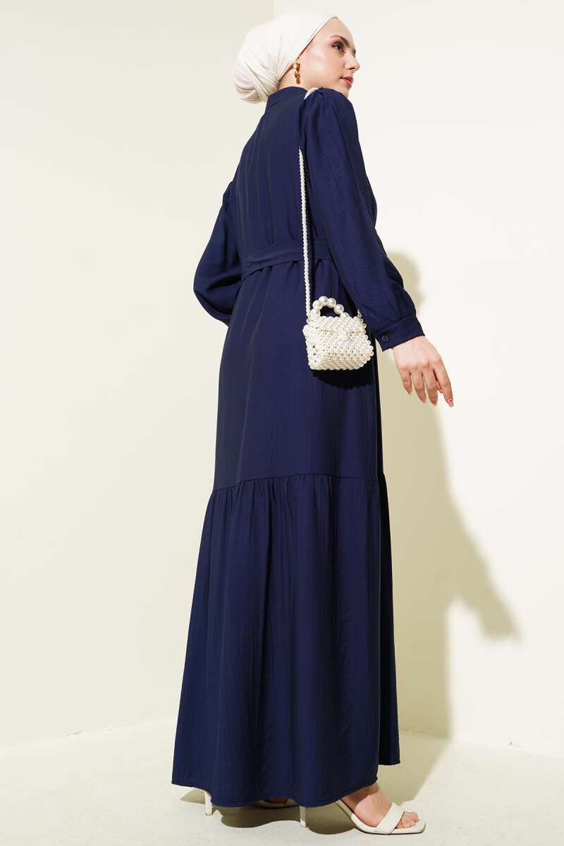 Yarım Yaka Fermuarlı Cepli Kot Elbise Lacivert