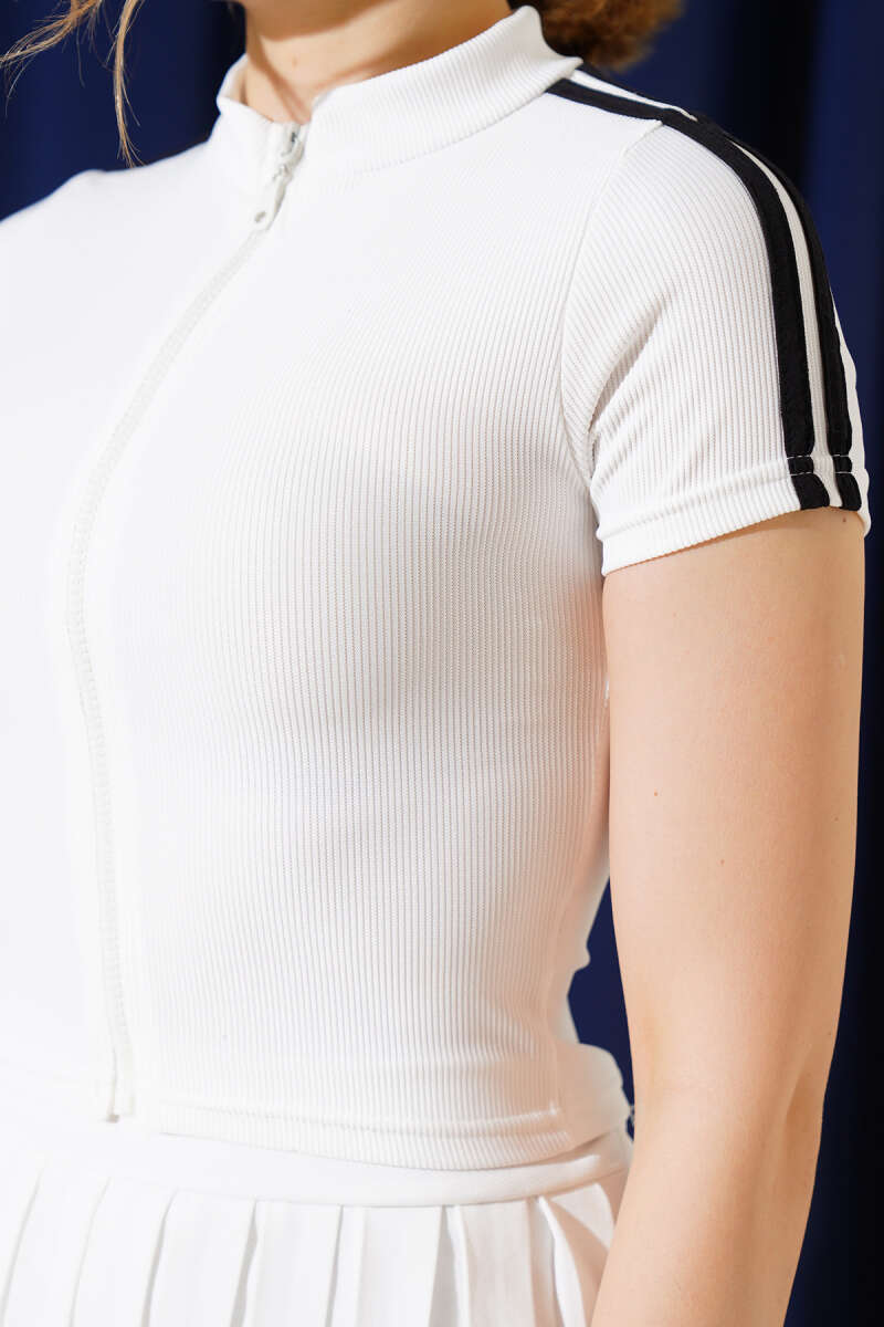 Boydan Fermuarlı Omuz Şeritli Crop Ekru