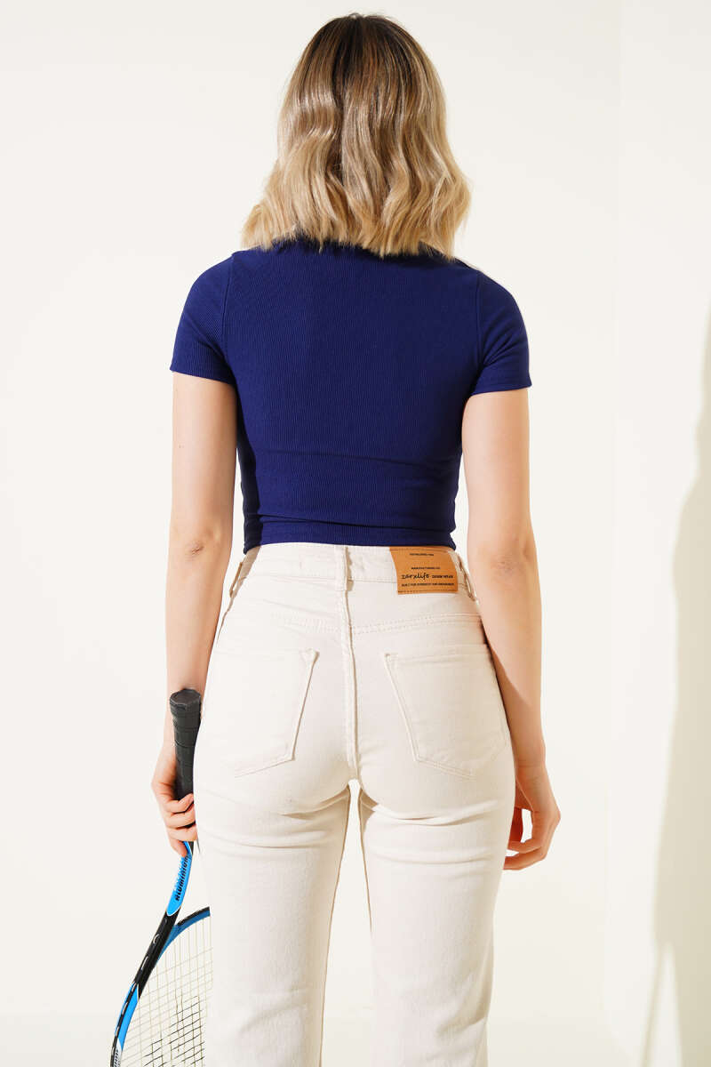 Boydan Fermuarlı Omuz Şeritli Crop Lacivert