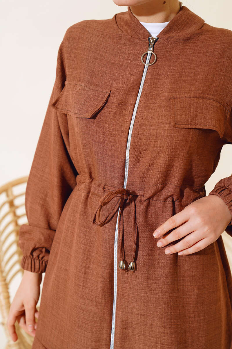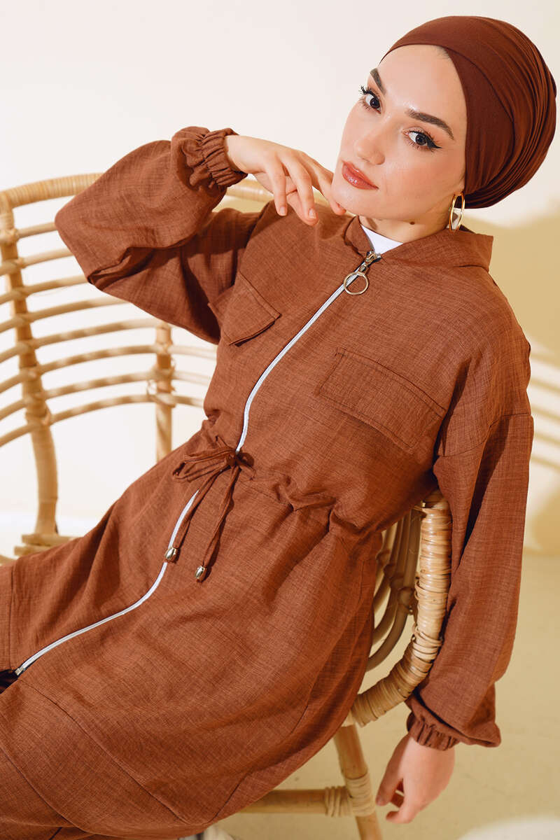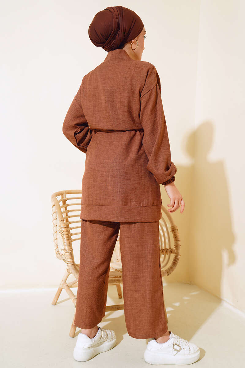 Boydan Fermuarlı Tünelli Keten İkili Takım Kahve