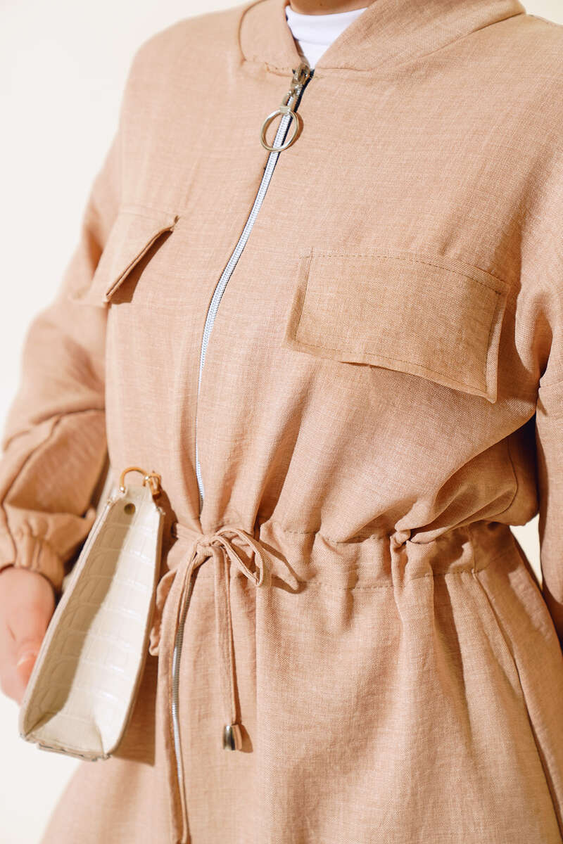 Boydan Fermuarlı Tünelli Keten İkili Takım Latte