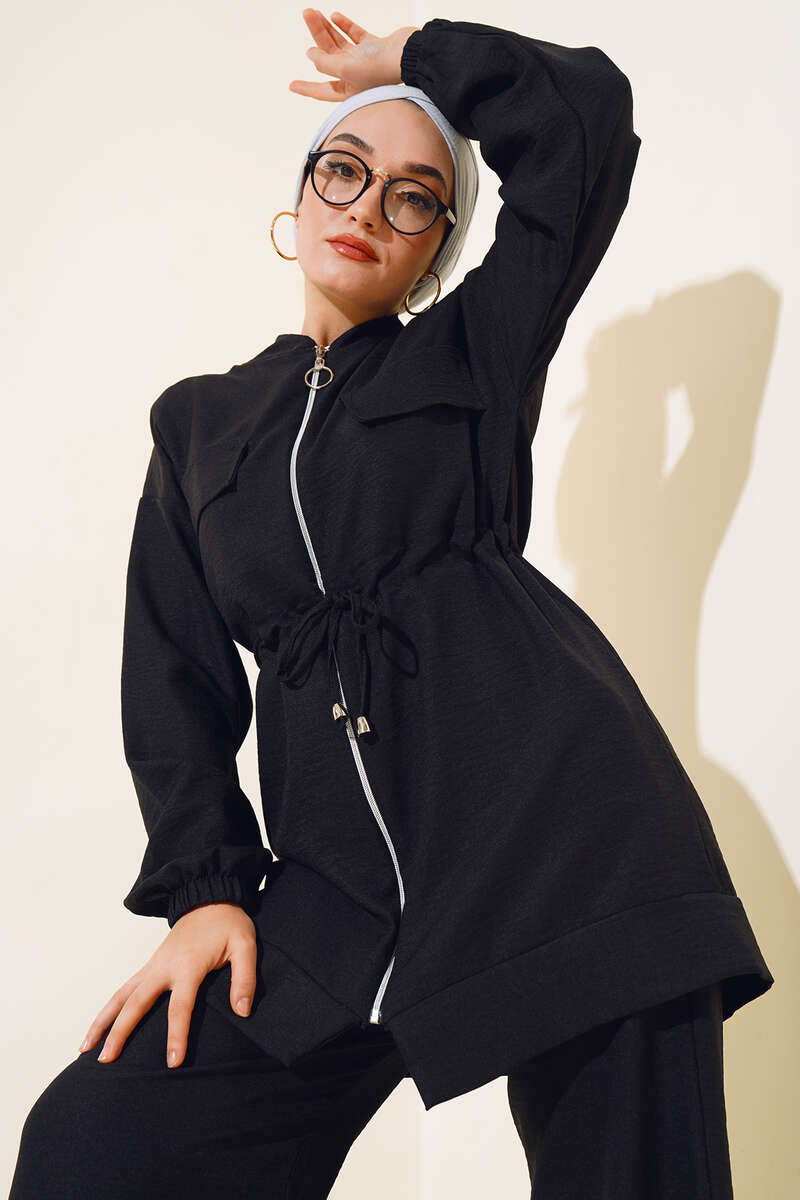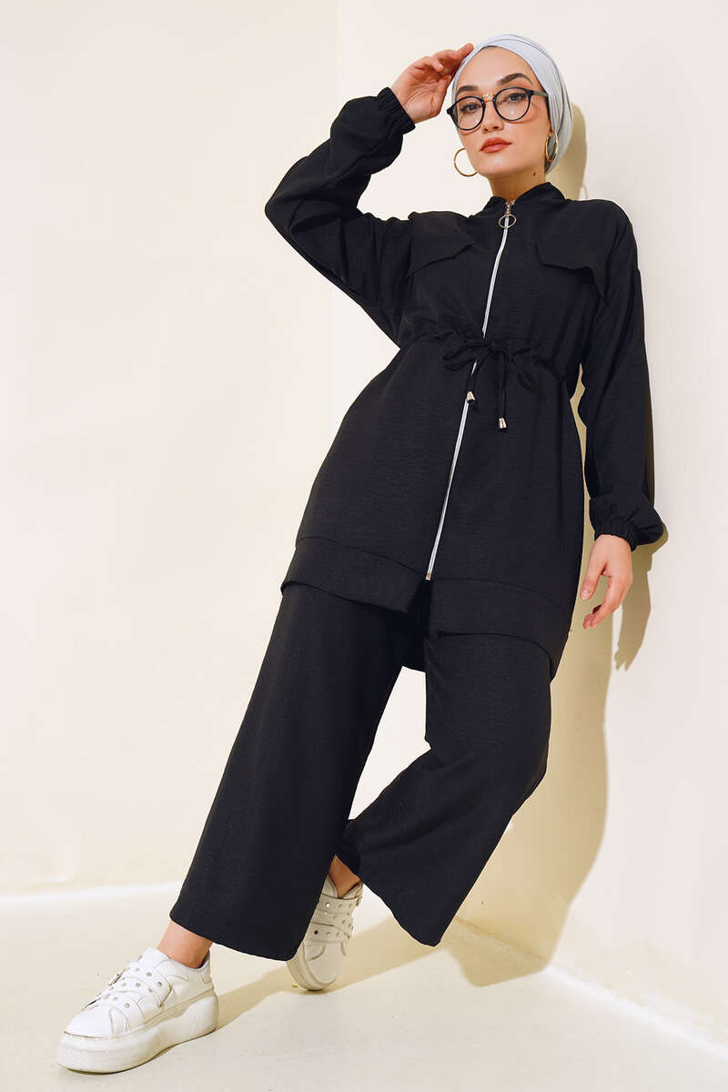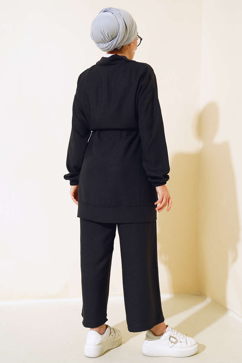 Boydan Fermuarlı Tünelli Keten İkili Takım Siyah