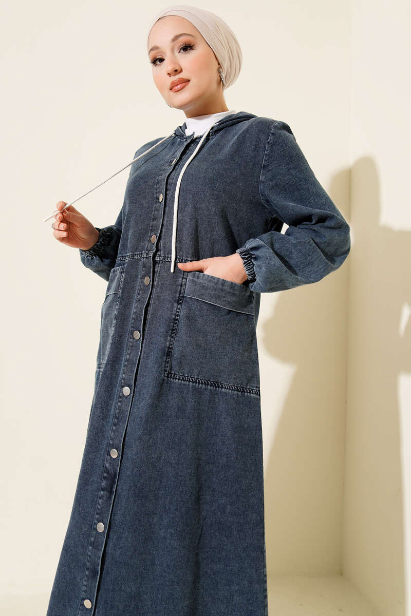 Boydan Metal Düğmeli Kapüşonlu Kot Elbise Mavi