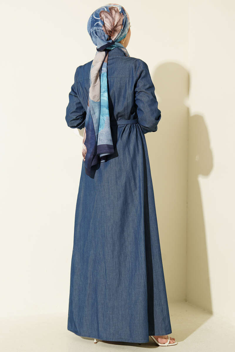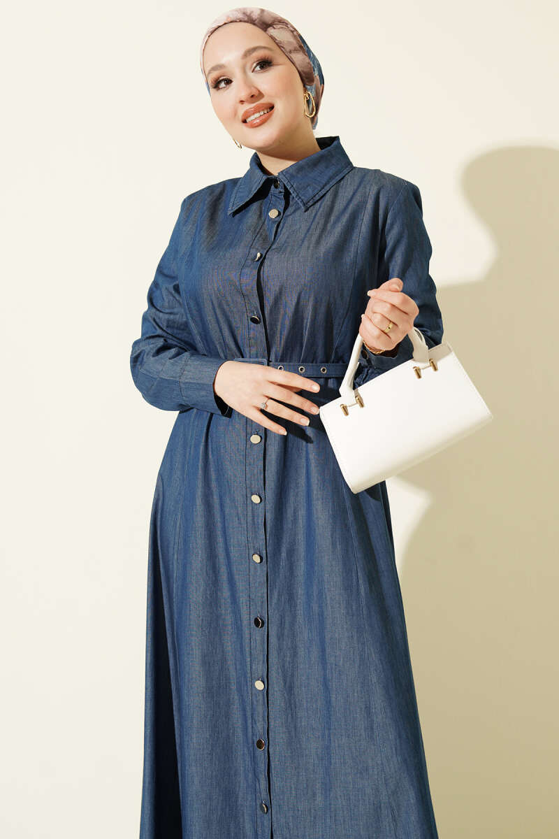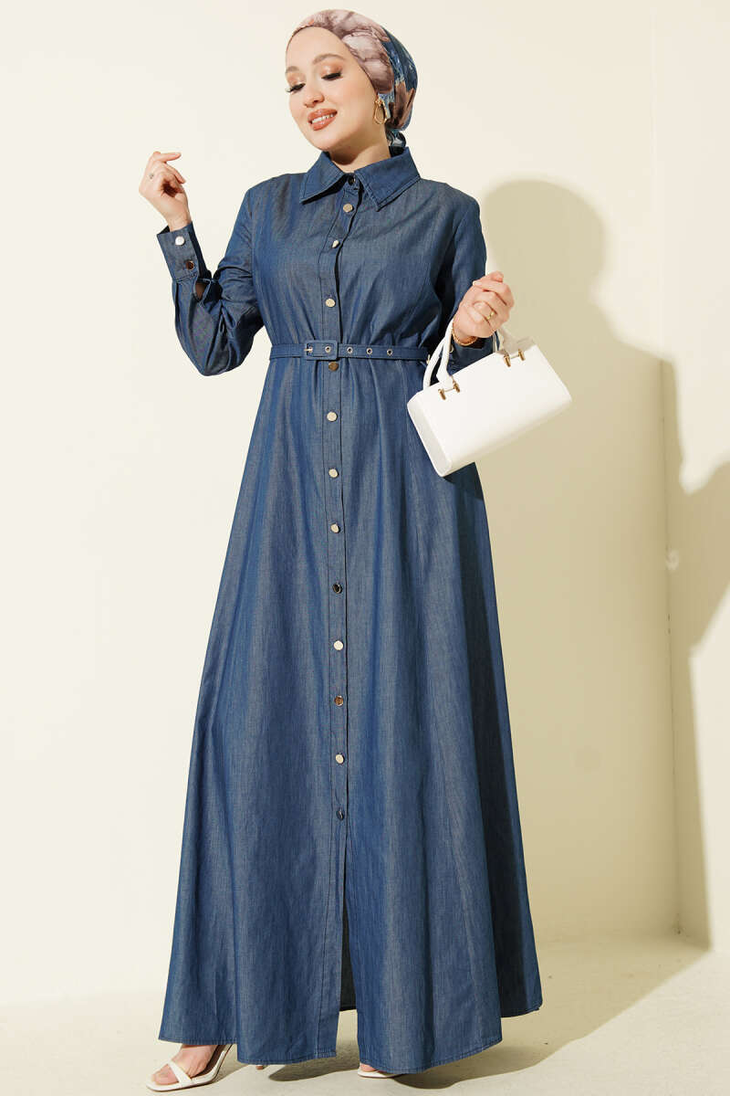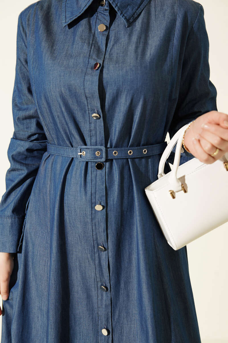Boydan Metal Düğmeli Kemerli Kot Elbise Mavi
