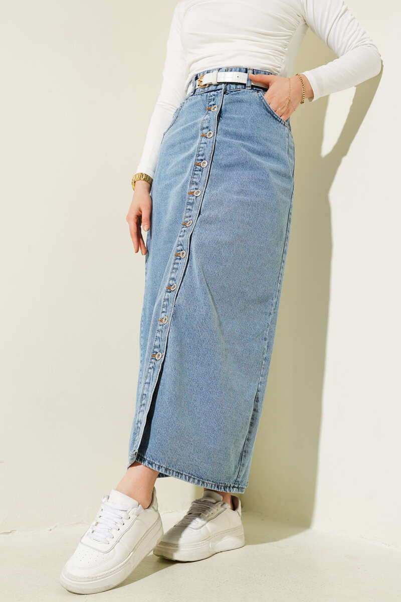 Kemerli Pile Detaylı Etek Lacivert