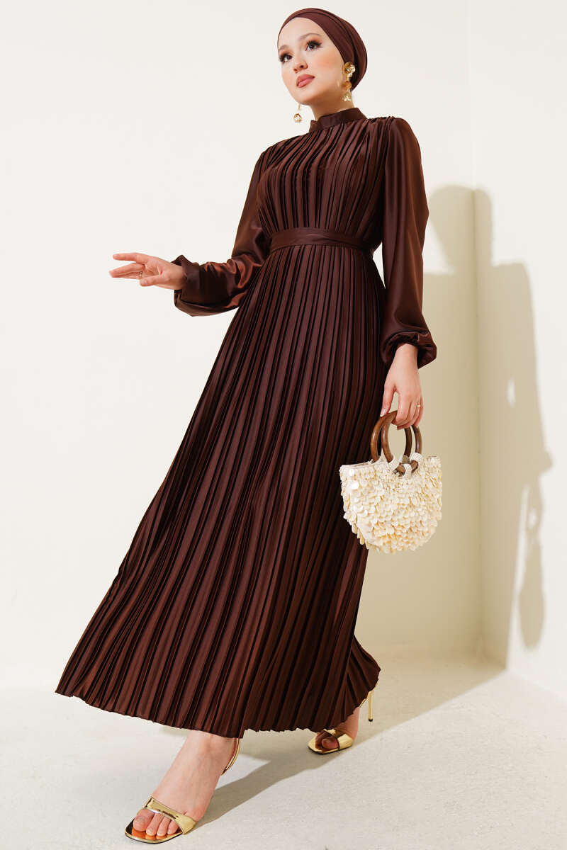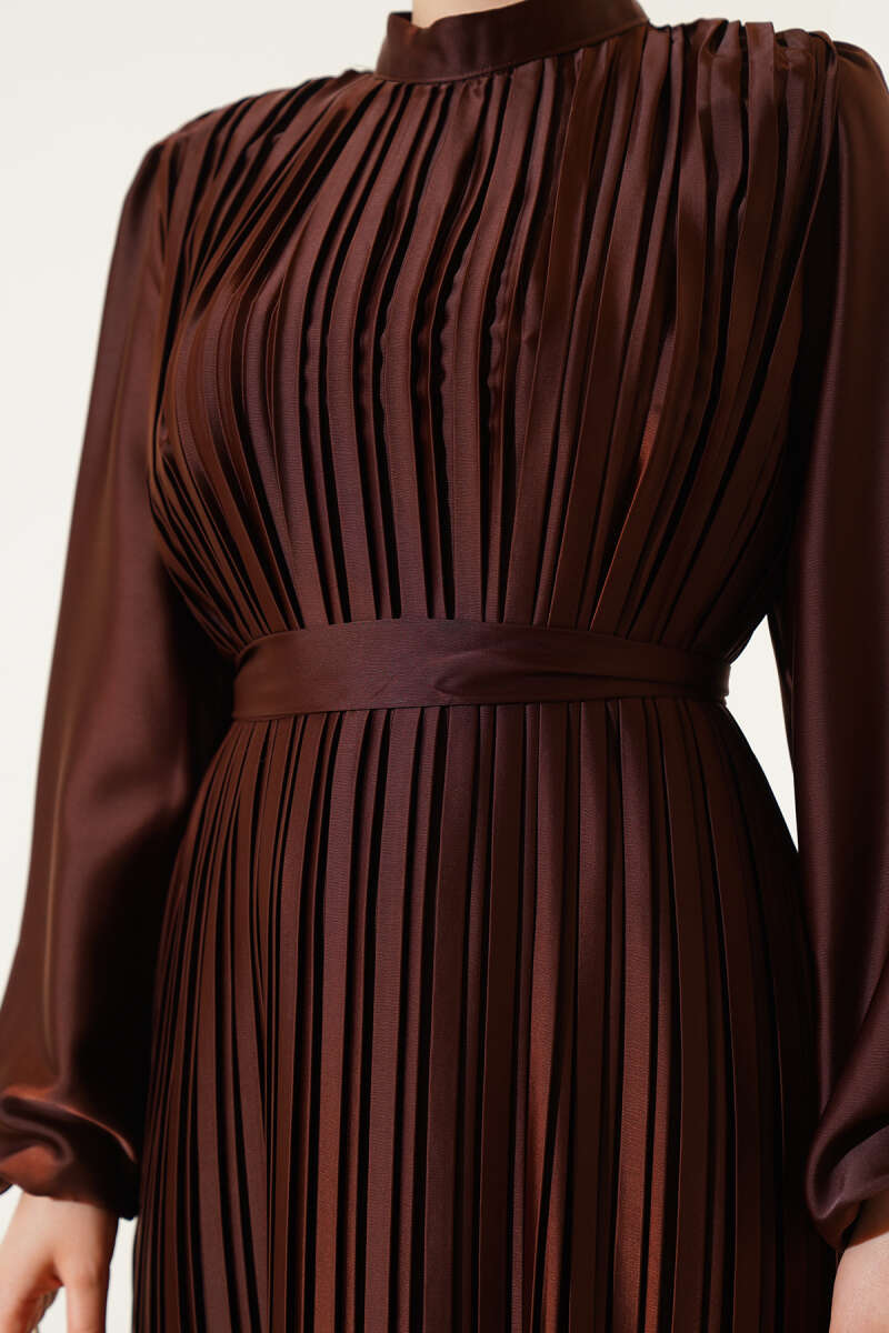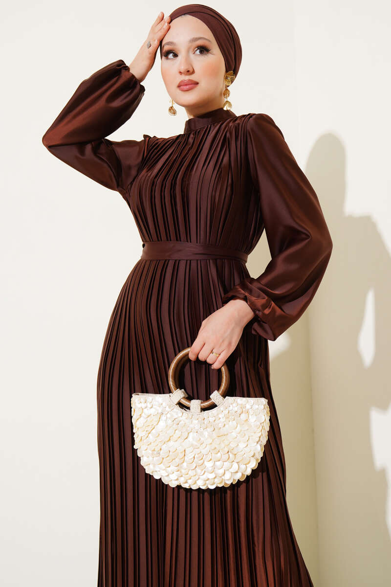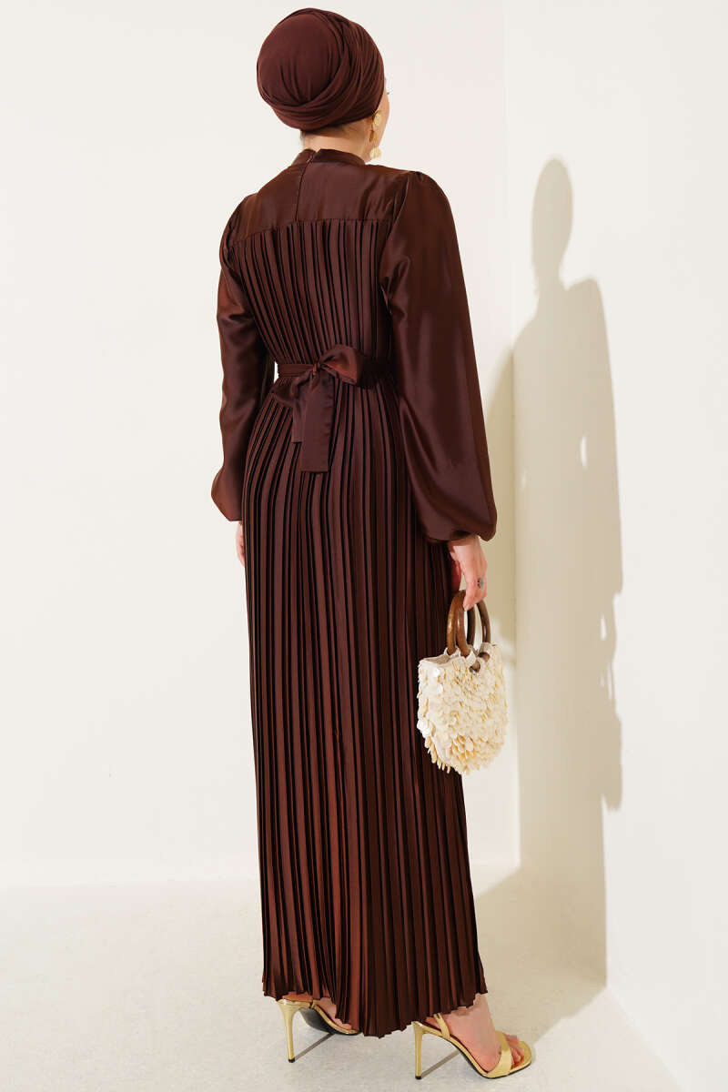 Kolları Fiyonk Detaylı Selanik Elbise Kahve