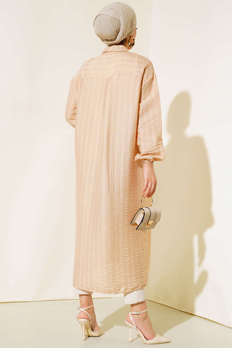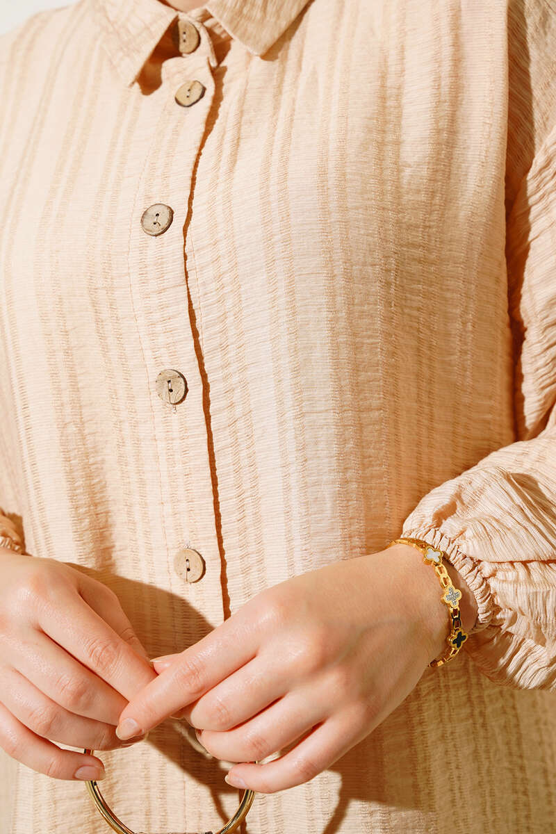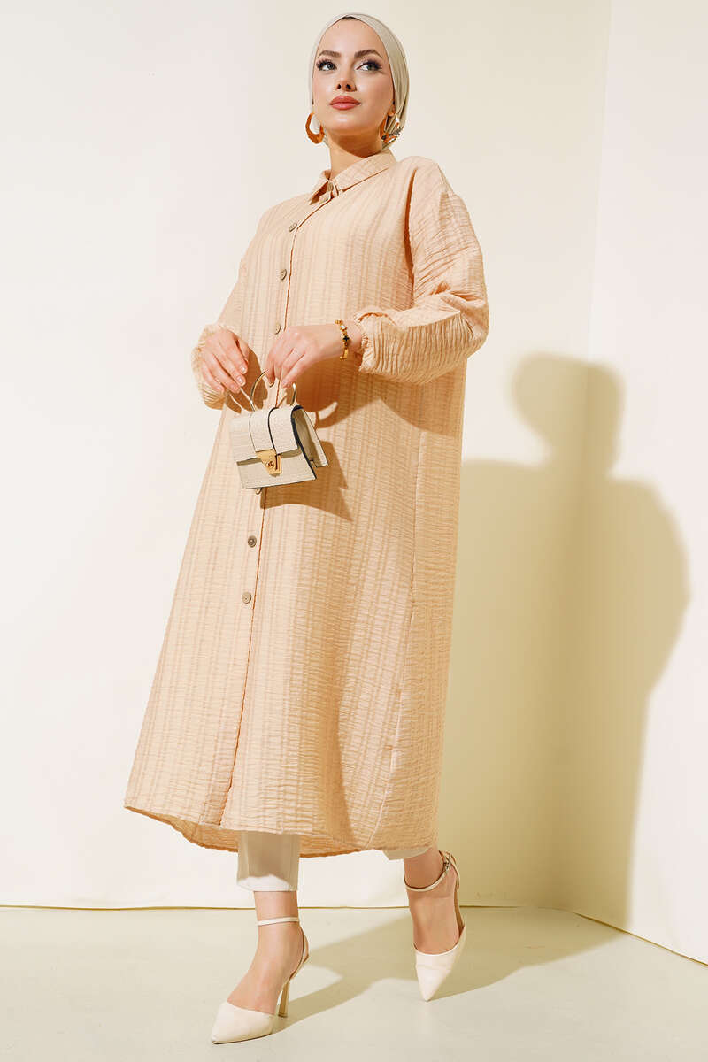 Yeni sezon tunik modelimiz sizlerle beraber. Tuniğimiz boydan tahta düğmeli modeldir. Kol bilekleri lastiklidir. Tuniğimiz klasik yaka olup, arkasında pens bulunmaktadır. Tuniğimiz rahat ve şık görüntüsüyle bahar ve yaz aylarının favorisi olacaktır.