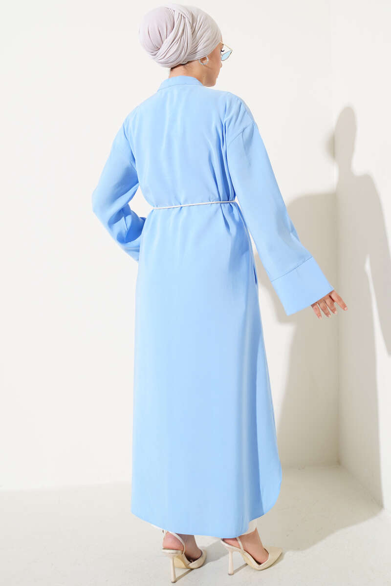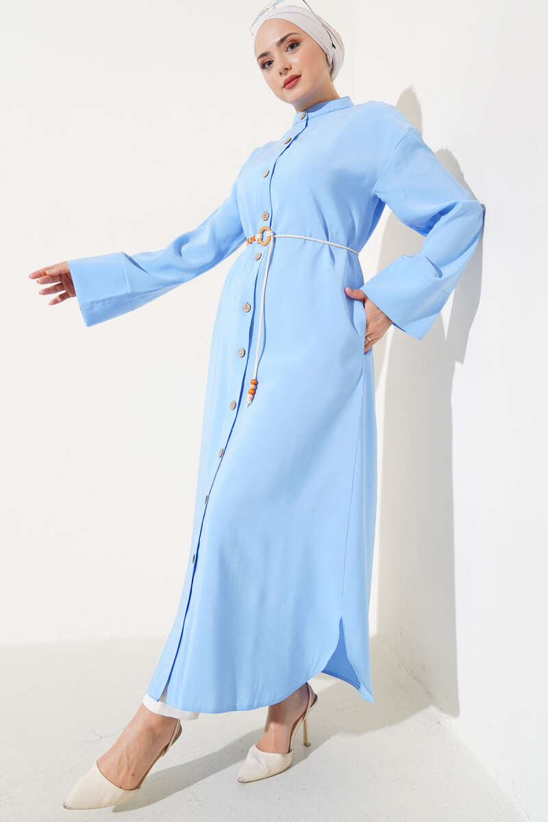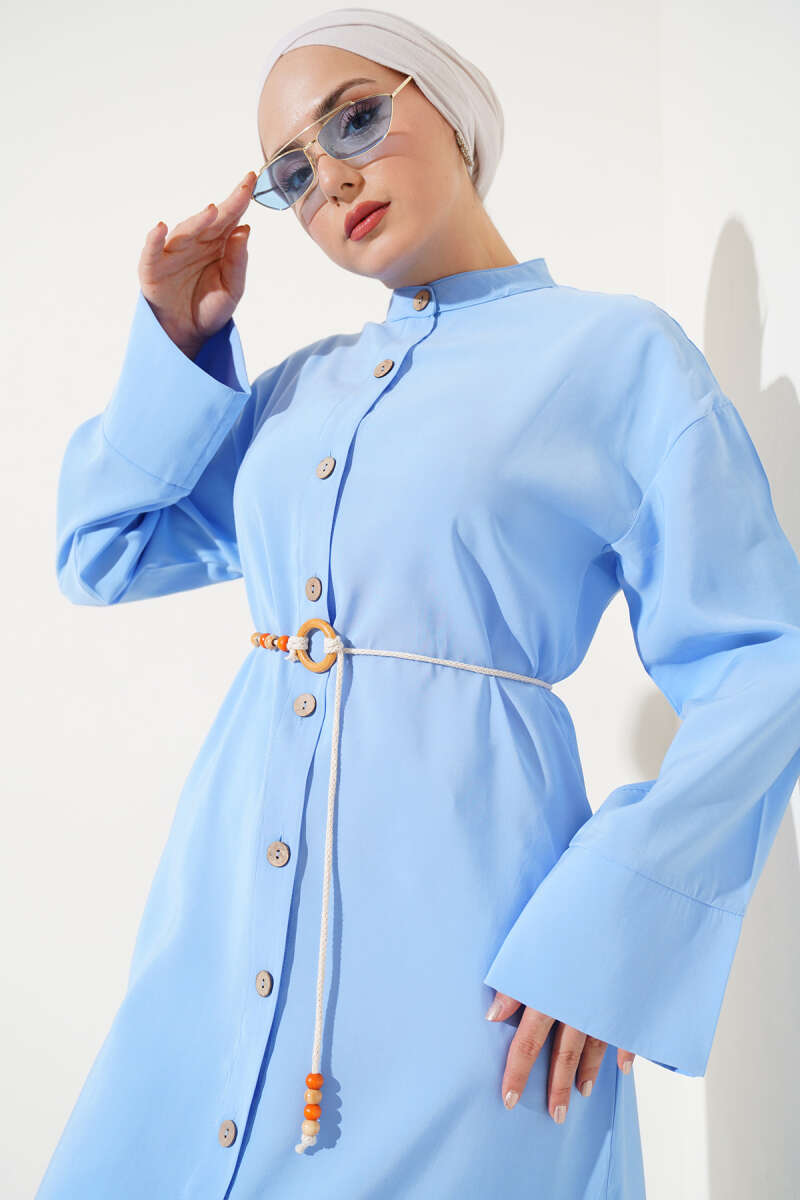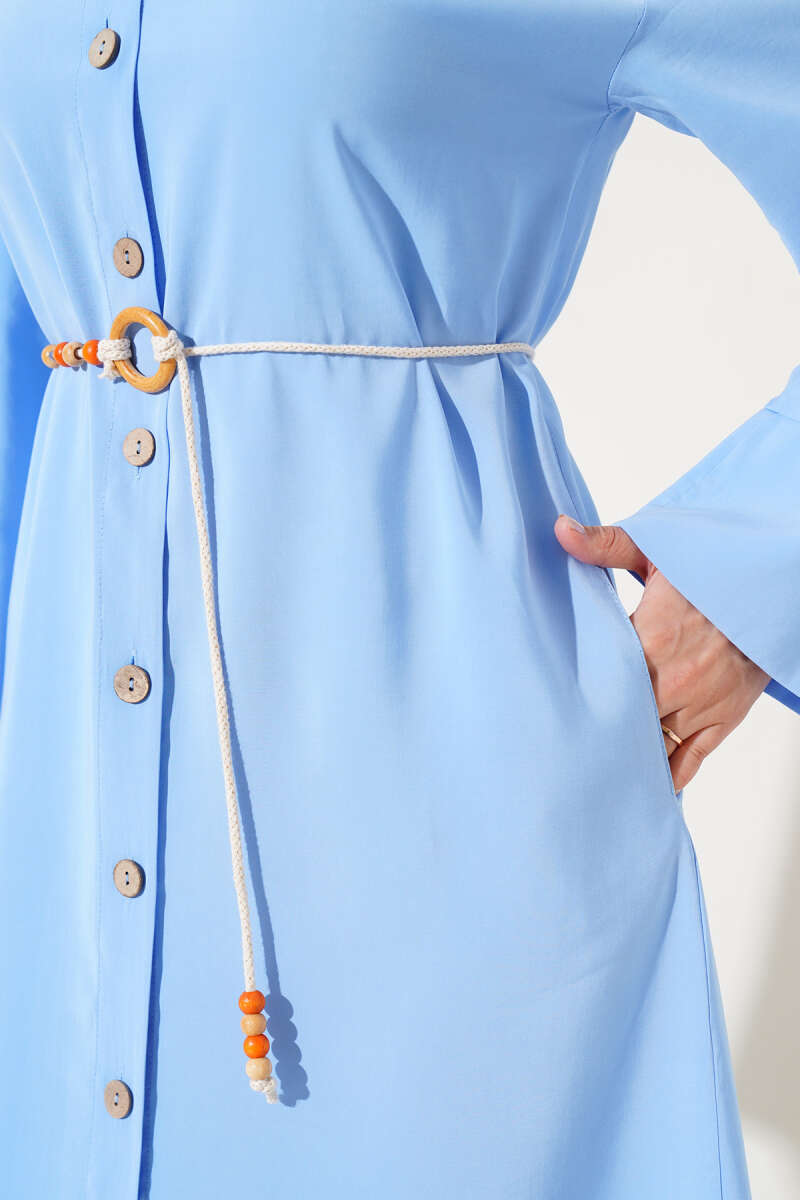 Boydan Tahta Düğmeli Tensel Elbise Mavi