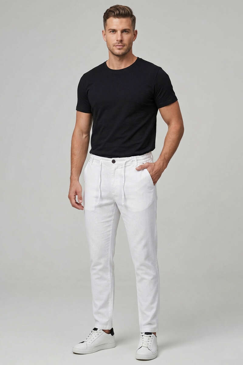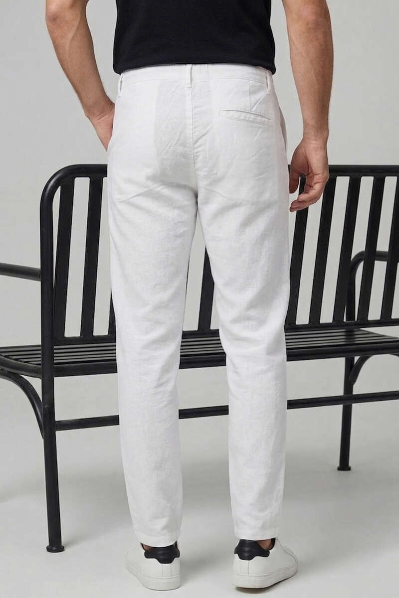 Nakışlı Keten Erkek Pantolon Beyaz