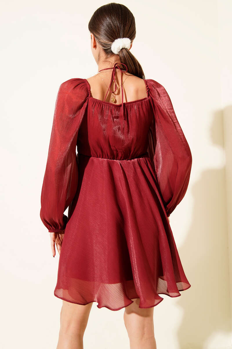 Boyun Bağcıklı Parlak Şifon Mini Elbise Bordo