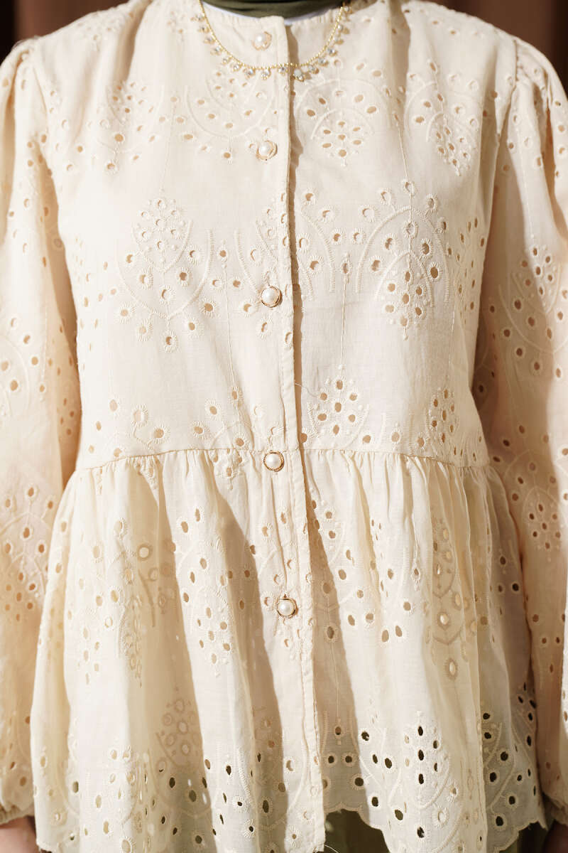 Brit Düğmeli Brodeli Gömlek Bej