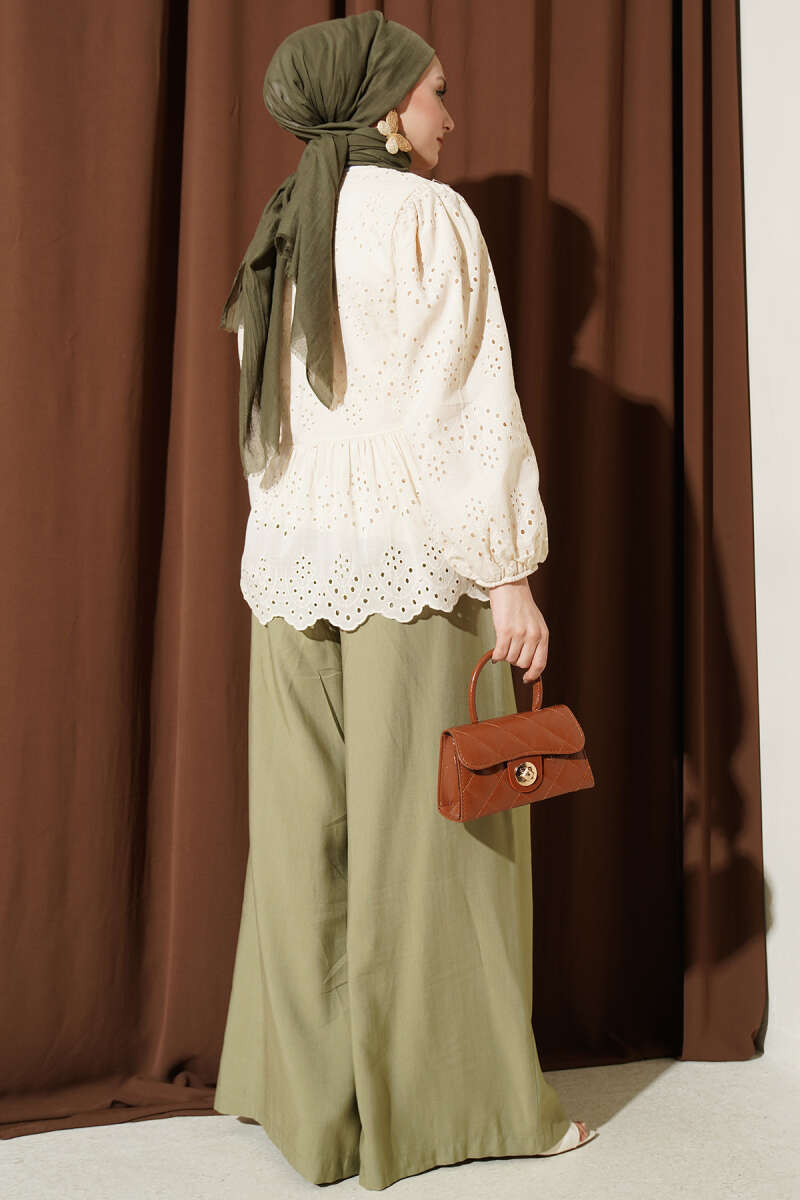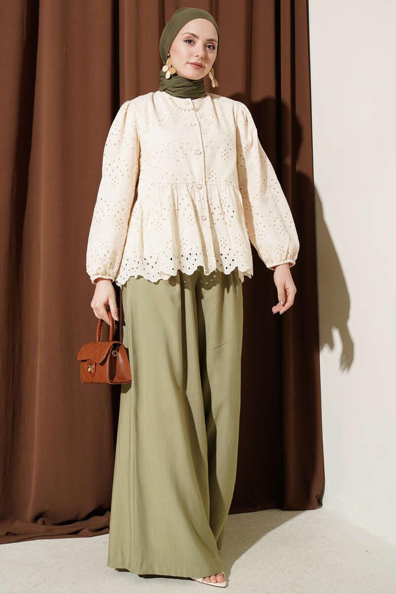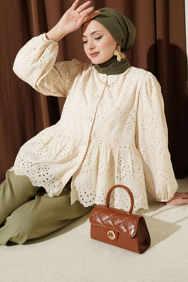 Omuz Pelerinli Taşlı Tensel Gömlek Ekru