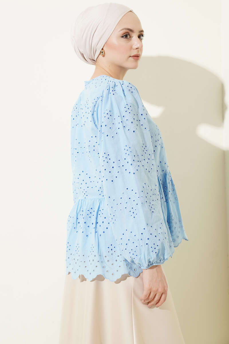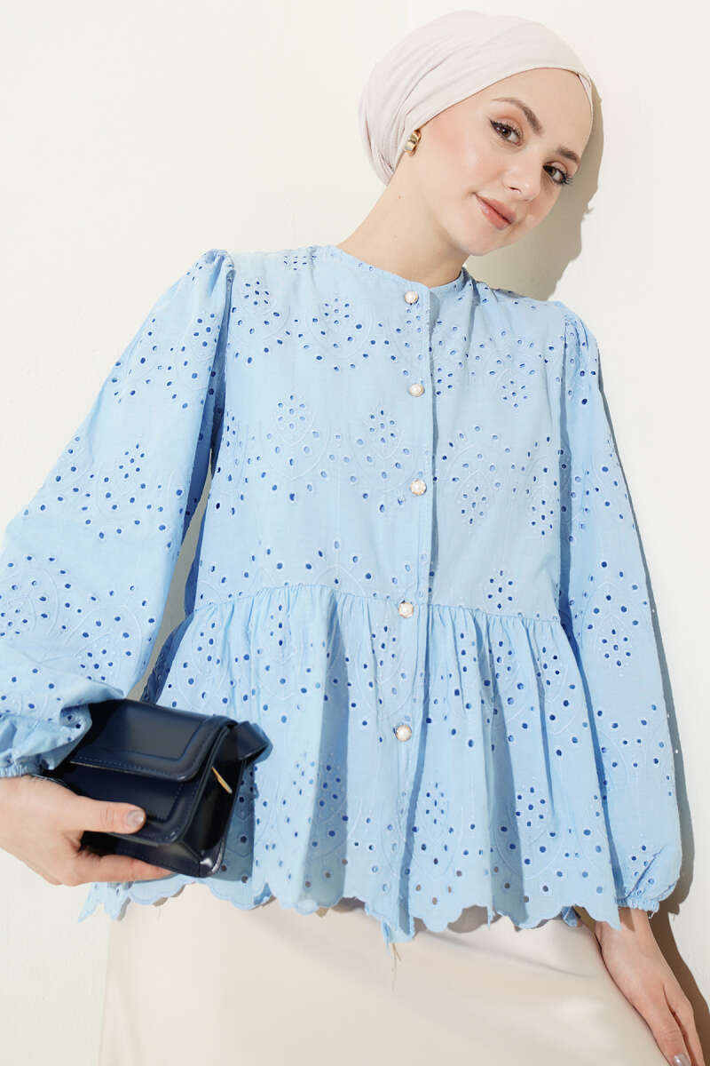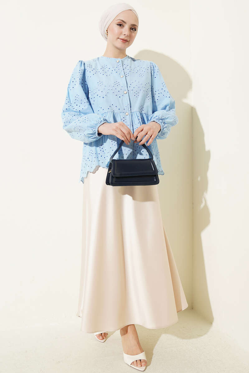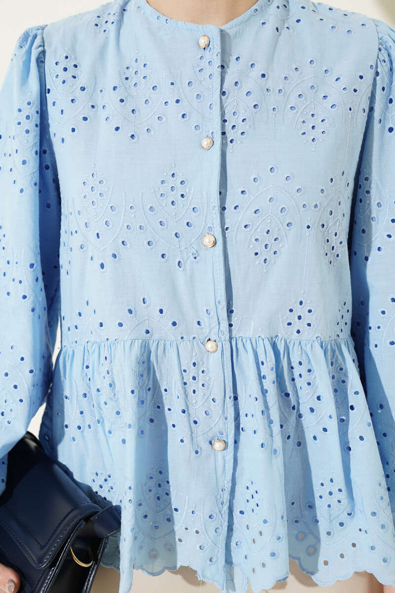 Omuz Pelerinli Taşlı Tensel Gömlek Mavi