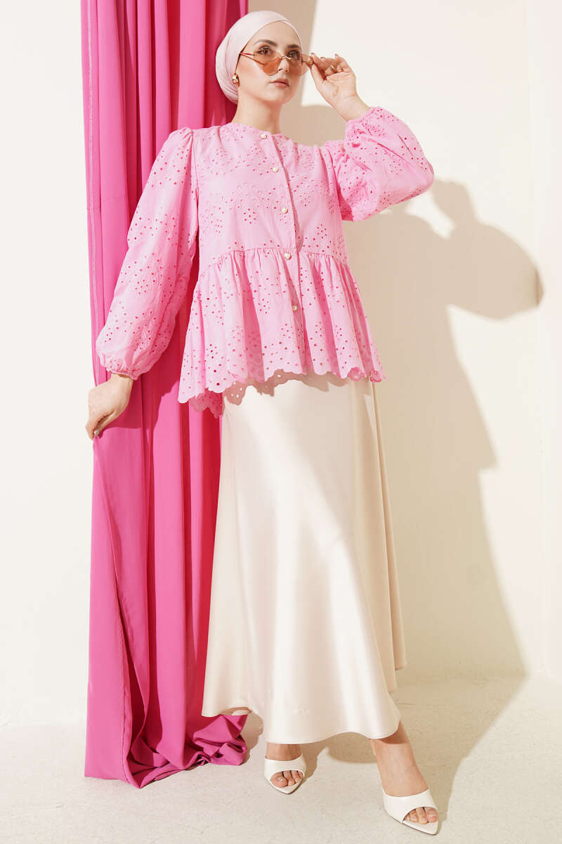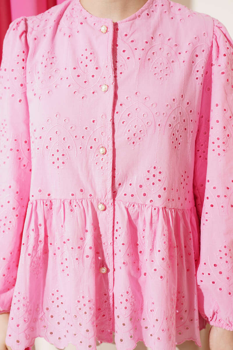 Brit Düğmeli Brodeli Gömlek Pembe
