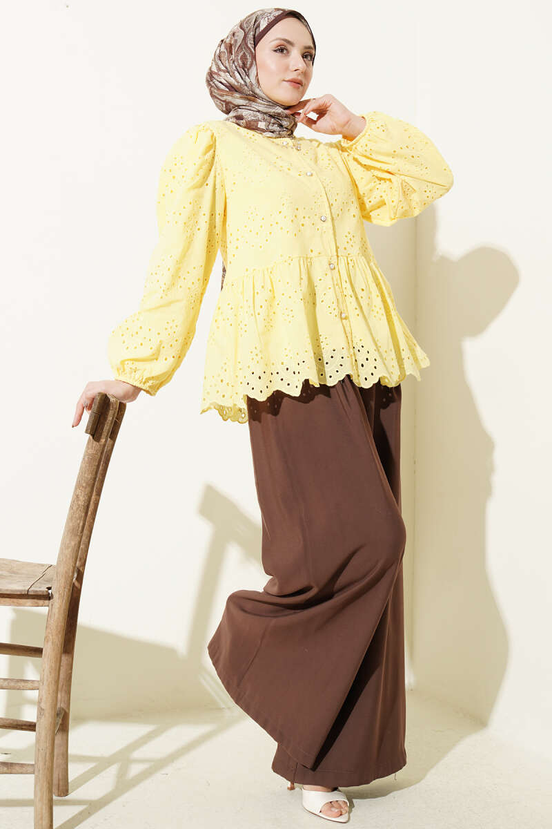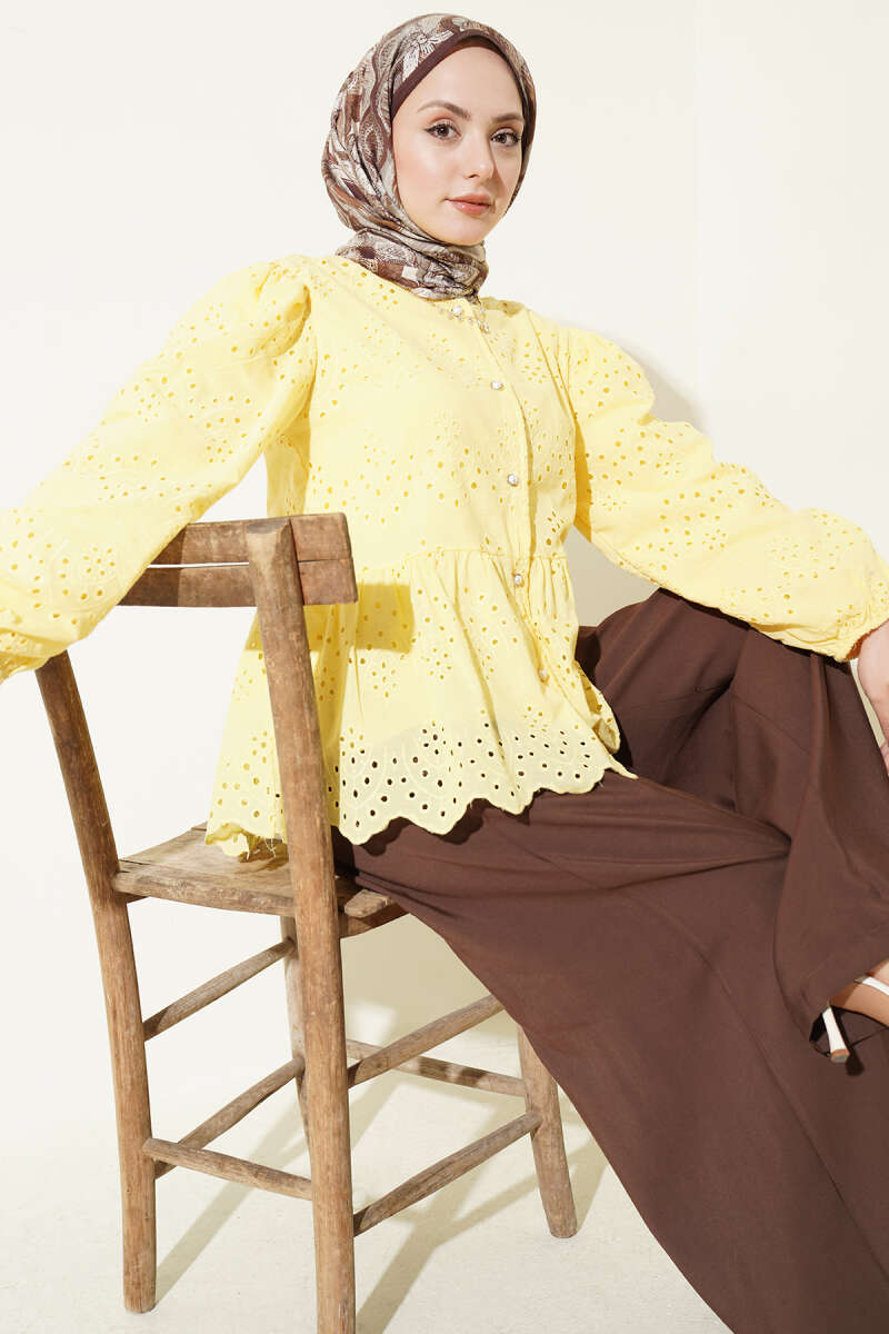 Omuz Pelerinli Taşlı Tensel Gömlek Sarı