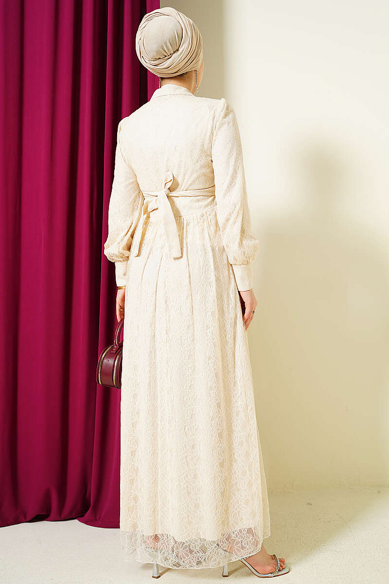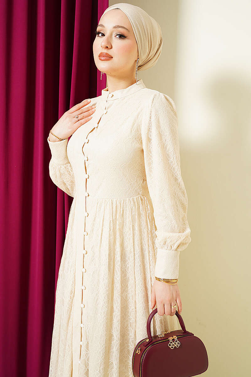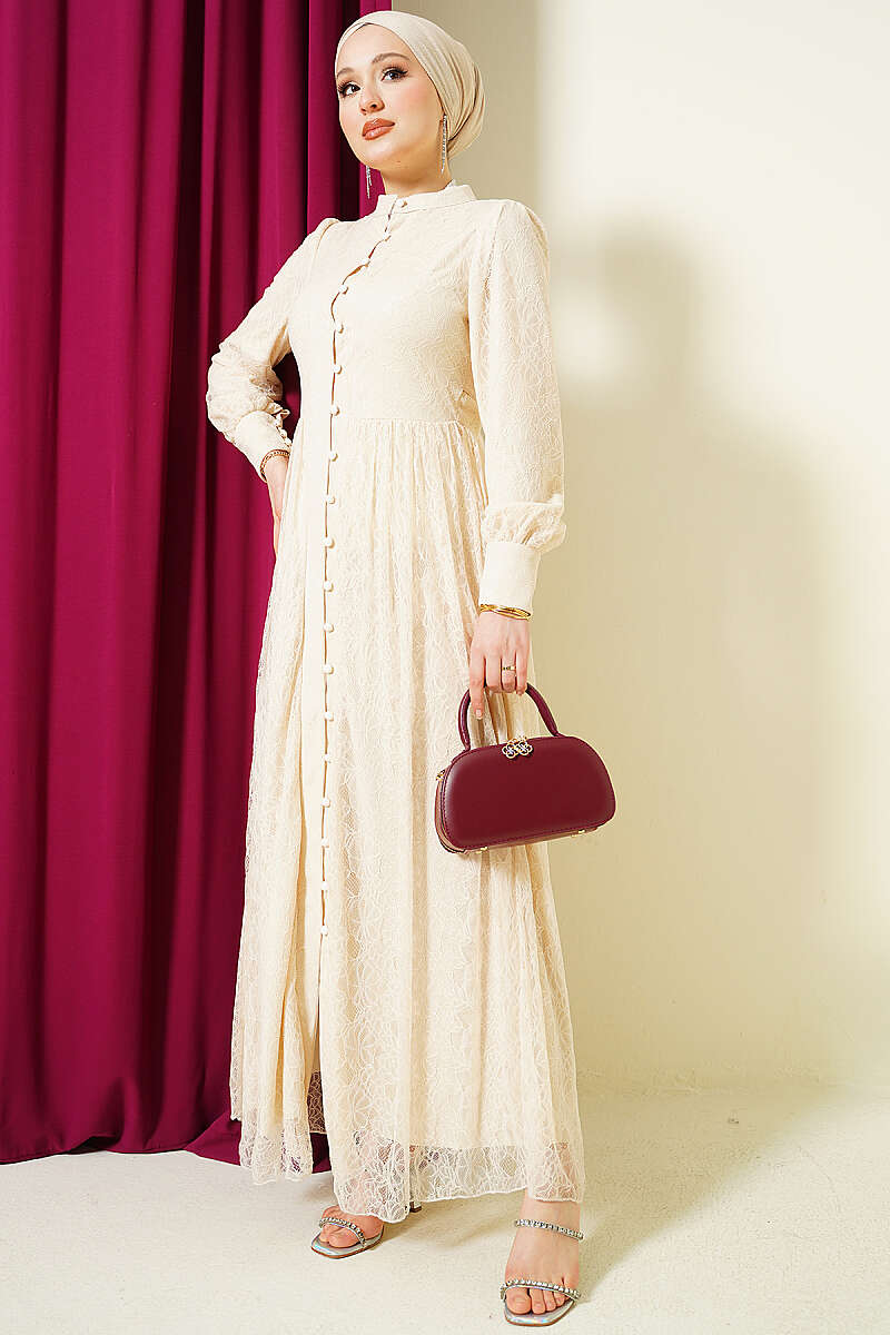 Brit Düğmeli Dantelli Abiye Elbise Bej