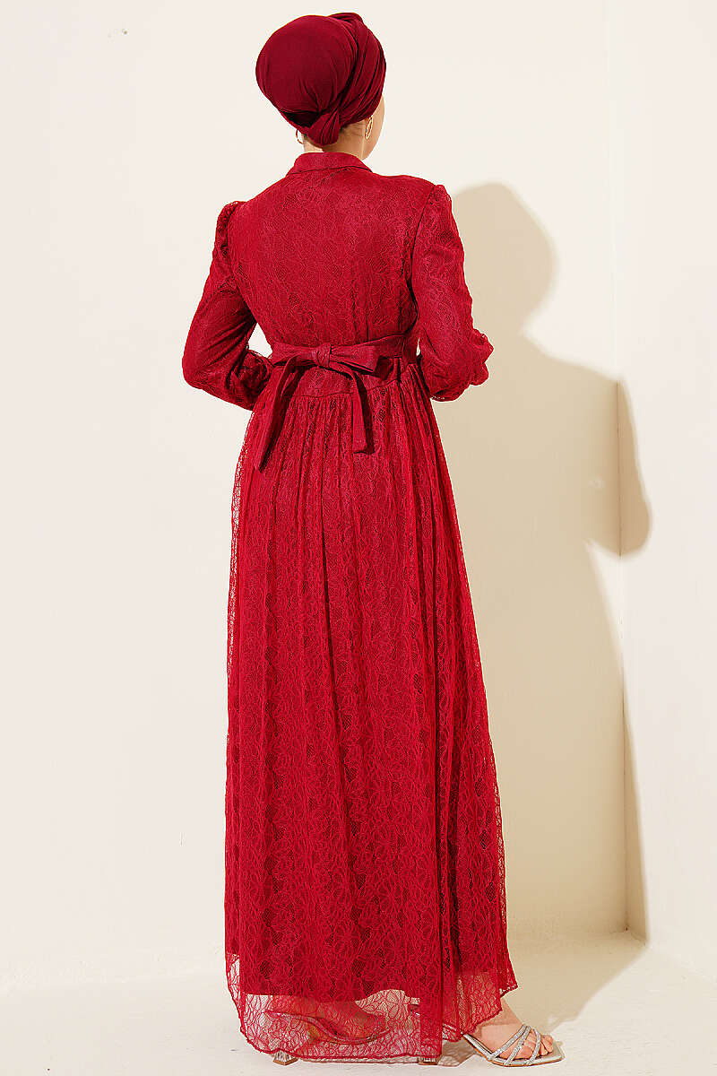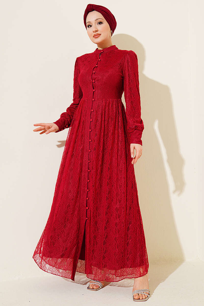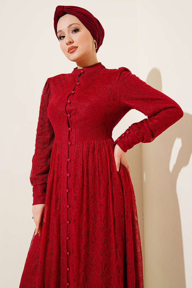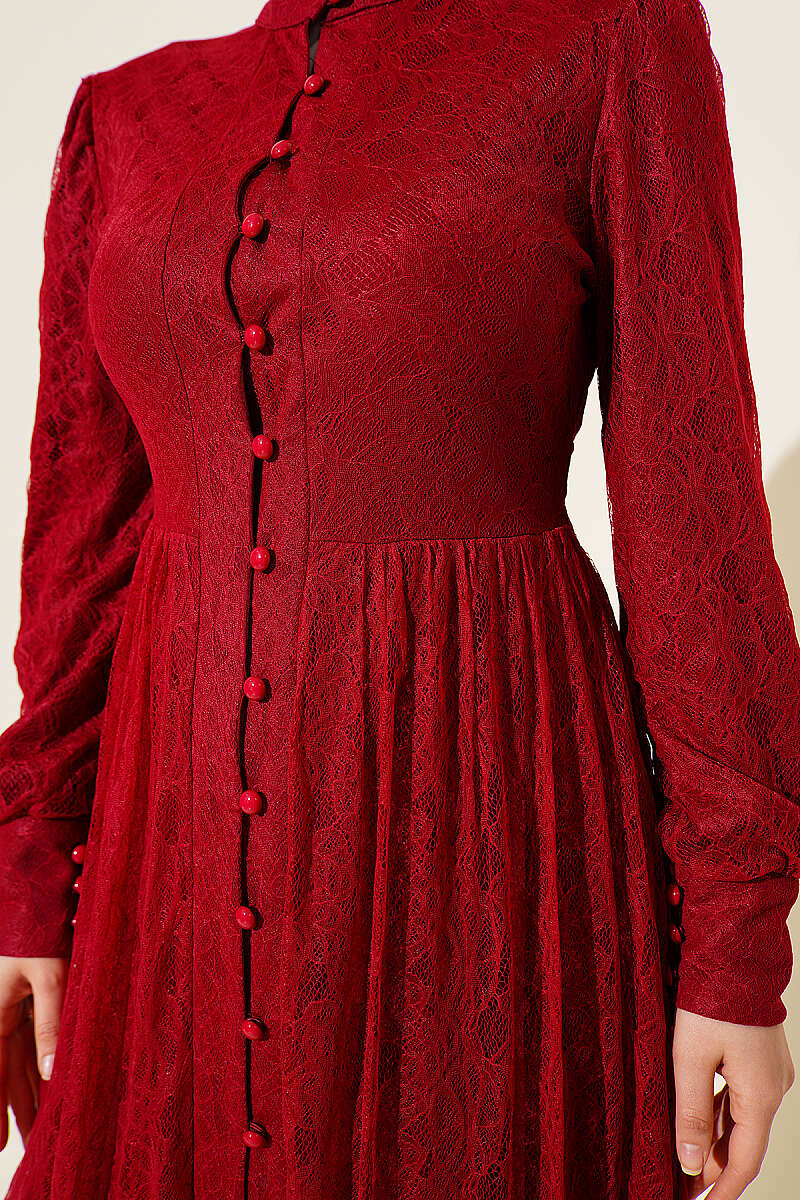 Brit Düğmeli Dantelli Abiye Elbise Bordo